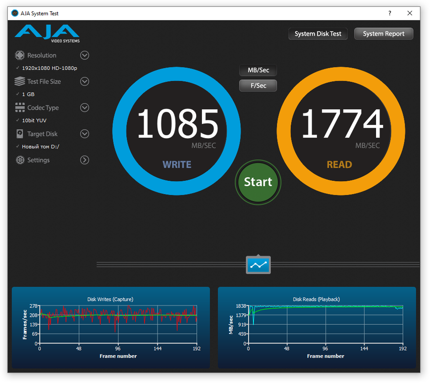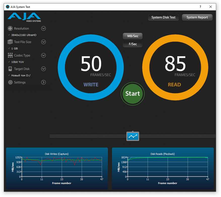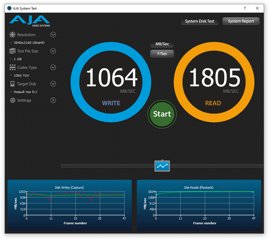 При тестировании программой AJA System Test нужно использовать размер файла 64 Gb, в вашем случае вы тестируете
