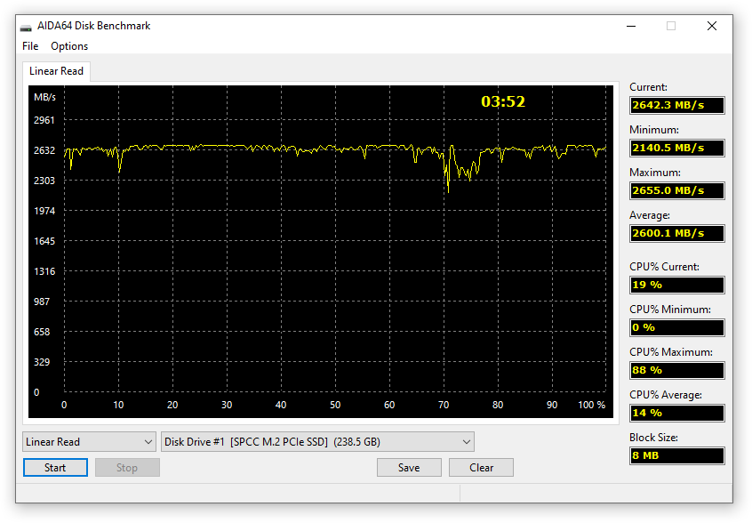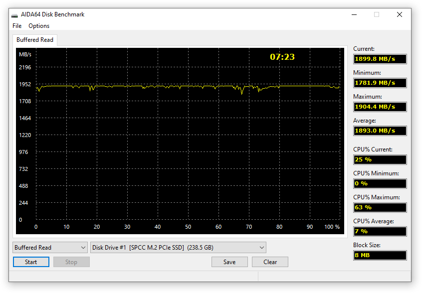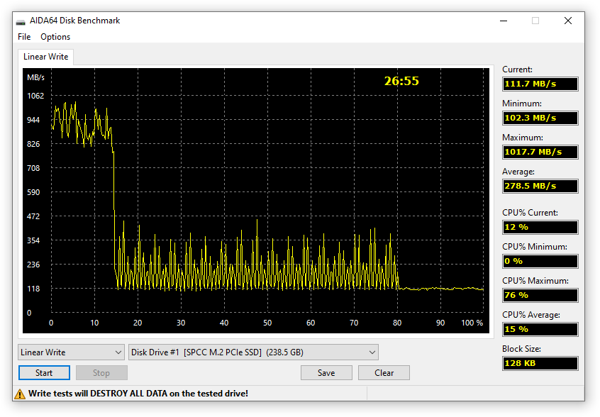 В большинстве тестов AIDA64 показала близкие к указанным характеристикам результаты, за исключением теста на запись, где после заполнения выделяемого кэша происходит падение скорости передачи данных примерно до 400 МБ/с.