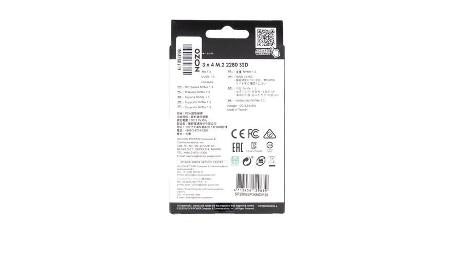 На тыльной стороне указана информация об используемом интерфейсе, напряжении в 3.3В, о производстве в Тайване. Под информацией о накопителе имеются контактные данные, штрих код продукта.