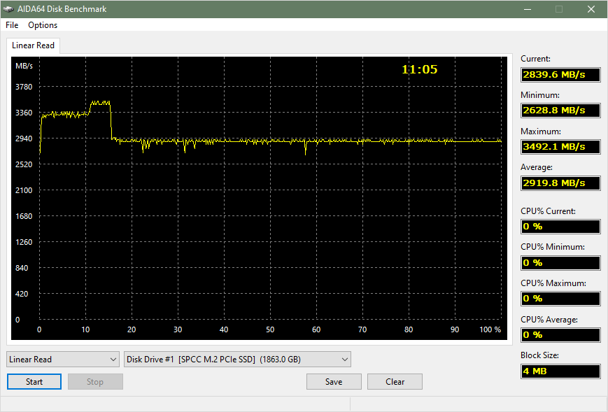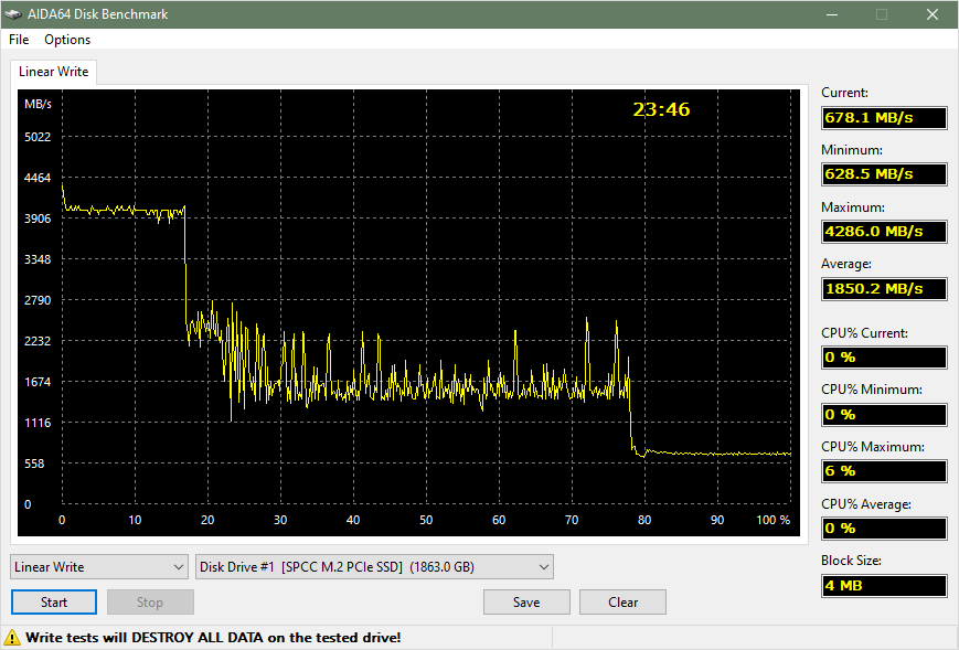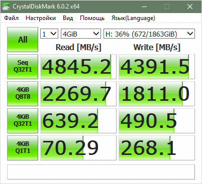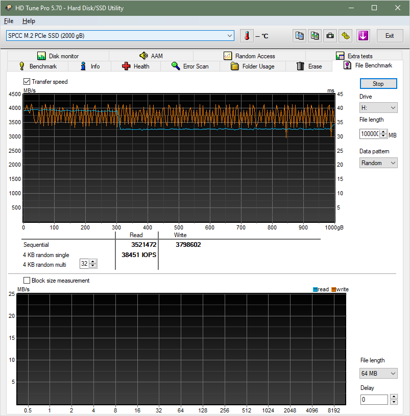 Чтение и запись вышли за пределы возможностей PCIe 3, особенно чтение. А значит переход на более новый и актуальный стандарт был не напрасен. Если вспомнить, например, Kingston NV2, то там достаточно и третьей версии. Здесь же с этим дела обстоят лучше. Запись шла в три этапа, на скорости около 4 ГБ/с, 1.6 ГБ/с и 0.6 ГБ/с. Последние 400 гигабайт пишутся на скорости теоретического максимума SATA 6 Гб/с, что не может не радовать.