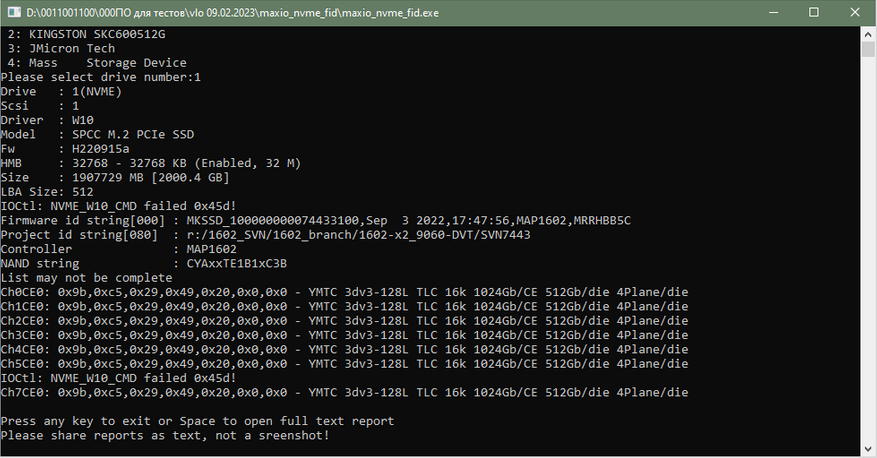 Вскрывать не пришлось, перебор утилит от vlo, спокойно опознал, "на чём" работает данный накопитель. В данном случае это связка Maxio MAP1602 и TLC память от YMTC. Эта связка достаточно часто стала мне попадаться и как видно, ничего плохого в ней нет. Еще недавно, на этого производителя смотрели косо, т.к. редкий и непонятный зверь, а сейчас память их производства очень часто стала встречаться.