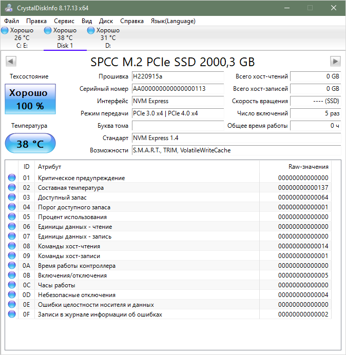 Накопитель включался пару раз, видимо для проверок, записей/чтений не было. Датчик температуры зафиксирован на отметке 38°. Перейдём сразу к тестированию в AIDA64.