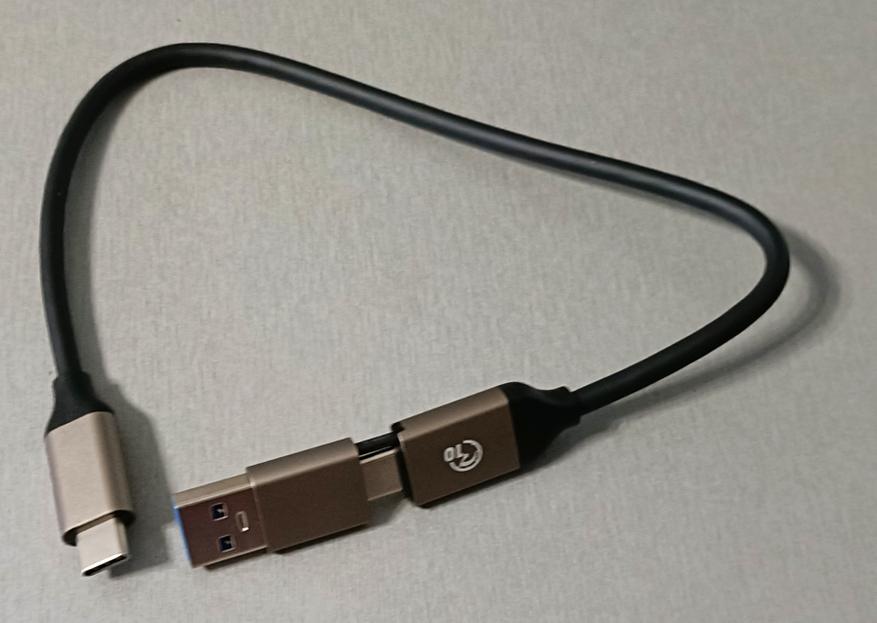 Комплектный кабель универсальный — снабжён «встроенным» переходником А — С. Длина 30 сантиметров — тоже для удобства пользователей телефонов или, в крайнем случае, ноутбуков, поскольку для компьютера коротковат. Единственное, что немного смущает — о поддержке каких-либо протоколов быстрой зарядки никаких упоминаний, а при использовании кабеля в качестве универсального это может иметь значение. Брать же кабель из комплекта телефона чревато — у многих таких всё хорошо с зарядкой, но только USB 2.0 для передачи данных. Лучше, когда о таких вопросах заботится производитель, не заставляя покупателя подбирать «правильный» кабель отдельно. Особенно когда покупатель не в состоянии этого сделать.