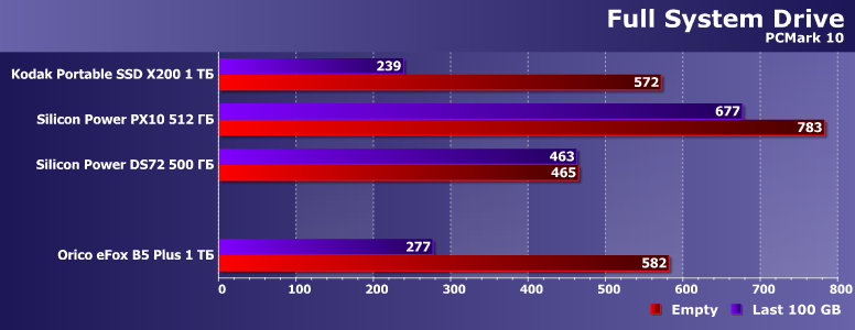 Понять всю картину нам как обычно поможет тестирование в PCMark 10 Storage Full System Drive, куда входит куча нагрузок — от запуска Windows 10, до простой работы в офисных приложениях. И несколько подтестов на копирование как мелких, так и больших файлов в разных направлениях — куда ж без них. Для обычных флэшек это слишком комплексный бенчмарк, но разные «быстрофлэшки» или, тем более, внешние SSD нередко и покупаются для того, чтобы туда всю рабочую среду взгромоздить и работать либо вообще без внутренних накопителей, либо никак их не затрагивая. Хотя сегодня у нас не тот случай — сразу понятно, что на практике для такого применения лучше вообще не смотреть в сторону таких моделей. Но, в любом случае, для быстрого сравнения разных устройств как раз комплексная оценка и хороша. Поэтому на неё и посмотрим. Не слишком гоняясь за разнообразием — ограничусь тем самым Kodak X200, Silicon Power PX10 и Silicon Power DS72. Первый той же ёмкости и примерно той же стоимости, прочие дороже — так что паритет в цене возможен лишь при двукратной разнице в ёмкости. Зато DS72 это вообще флэшка по размерам — никаких кабелей, ничего лишнего.
