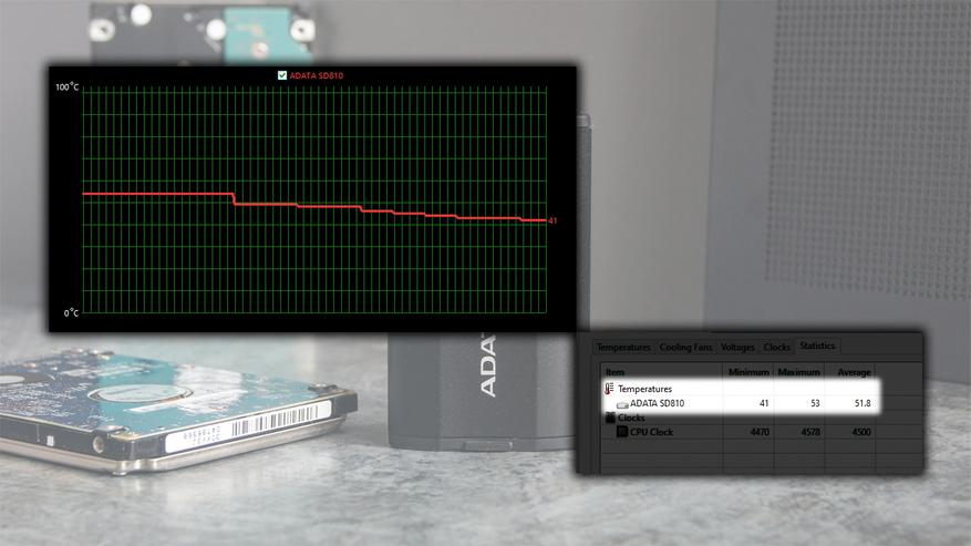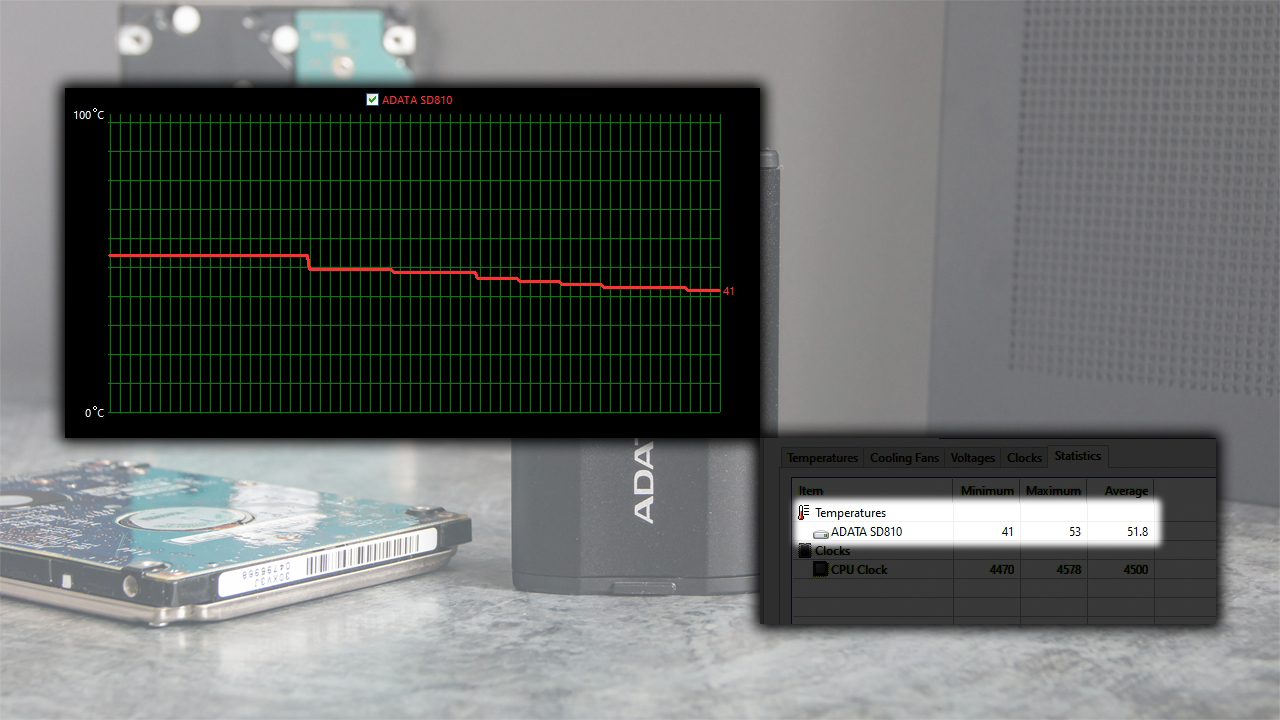 В процессе испытаний температура накопителя не превышала отметку 53°C, что свидетельствует о хорошей тепловой устойчивости. Подключение к высокоскоростной шине USB 3.2 Gen 2 x 2 безусловно увеличит нагрев, но вряд ли до критической точки. В состоянии покоя накопитель быстро охлаждается до температур порядка 40-42°C.