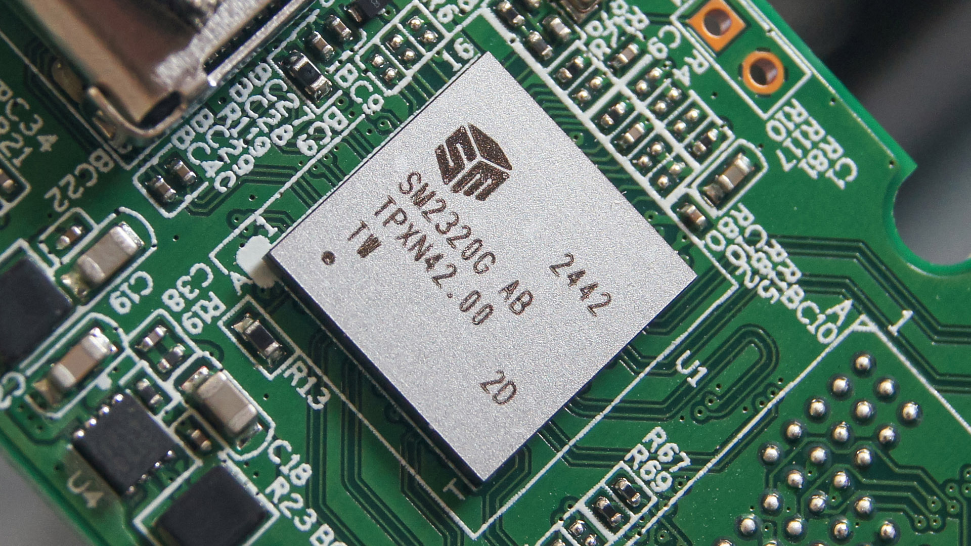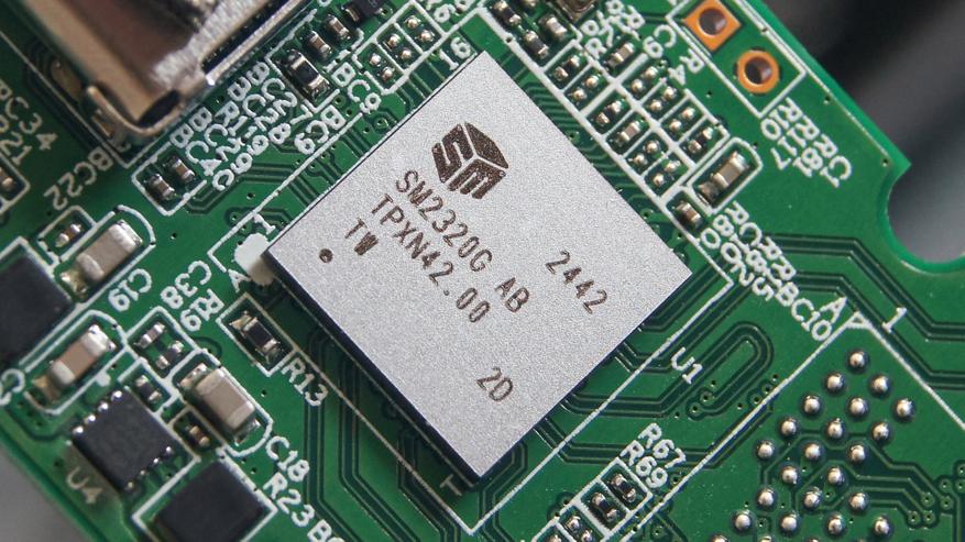 Зеленая печатная плата с установленными компонентами включает маленький серенький прямоугольник размером примерно 9x9 мм — контроллер Silicon Motion SM2320.