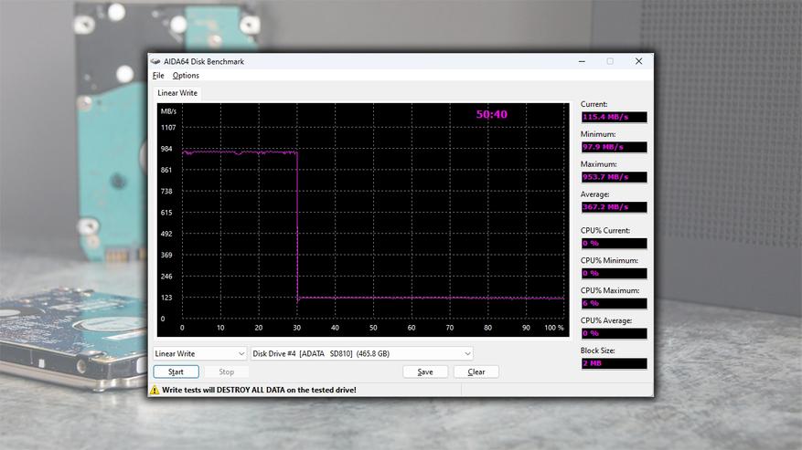 Запуск AIDA64 Extreme версии 4.70.3200 демонстрирует следующий процесс: сначала идет резкий старт с начальной скоростью ≈950 МБ/с (учитывая подключение к интерфейсу USB 3.2 Gen 2), затем, начиная с отметки около 30% заполненности диска, скорость уменьшается до стабильных значений примерно ≈120 МБ/с вплоть до полного завершения операции записи всего объема. Полностью записать весь объем потребовалось приблизительно 51 минута.