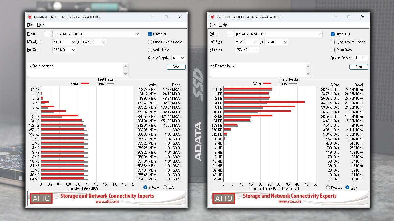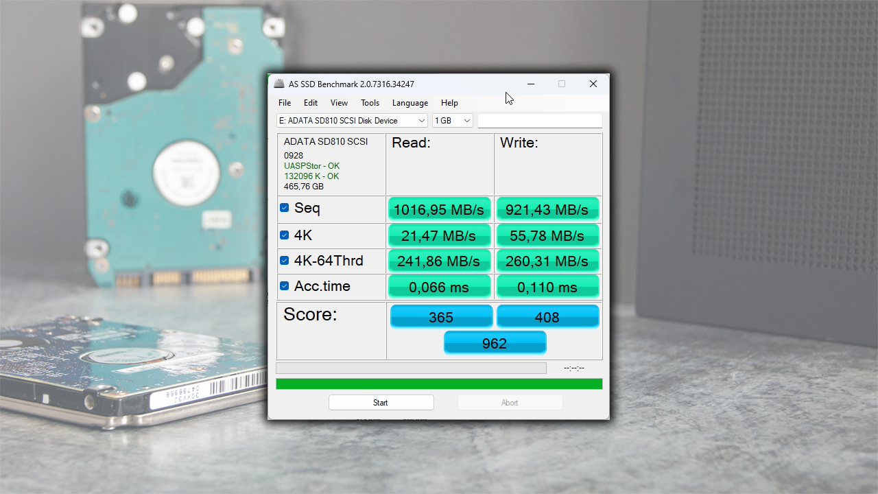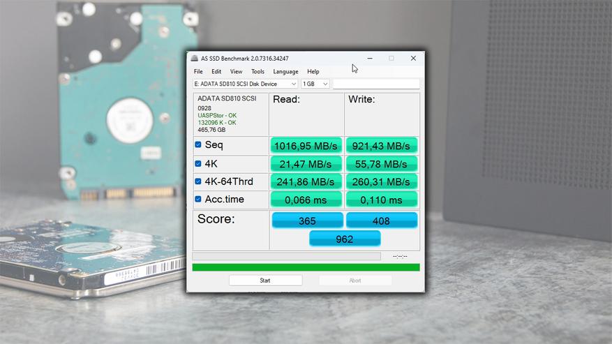 ADTA SD810 использует интерфейс USB 3.2 Gen 2 x 2 (до 20 Гбит/с). Запустив тесты, выяснилось неприятное обстоятельство: мой компьютер с материнской платой MSI PRO-B650M-P не поддерживает интерфейс USB 3.2 Gen 2 x 2, ограничиваясь стандартом USB 3.2 Gen 2 (до 10 Гбит/с). Таким образом, пределы производительности накопителя оказались искусственно заниженными до ≈1000 МБ/с, что существенно ниже заявленных характеристик. Это обусловлено ограниченными возможностями моей материнской платы.