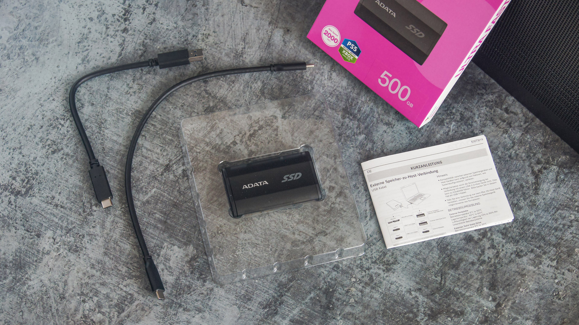 Продукт упакован в яркую коробку насыщенного розового оттенка, типичного размера упаковки аналогичных изделий. Внутри покупатель найдет два кабеля (USB 3.2 Gen 2 Type-A и USB 3.2 Gen 2 x 2 Type-C), документацию и непосредственно сам накопитель, аккуратно размещенный в прозрачном пластиковом держателе.