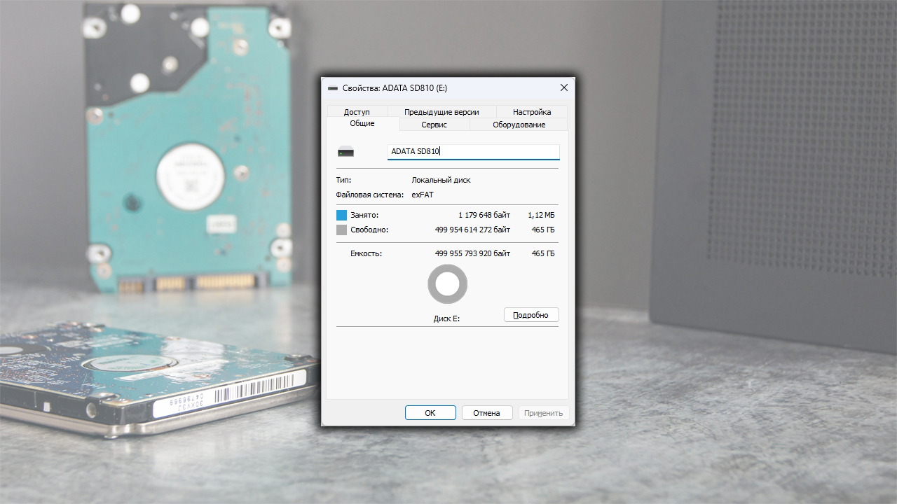 По умолчанию накопитель отформатирован в файловой системе exFAT, предоставляя пользователю практически полный доступный объем 465 ГБ.