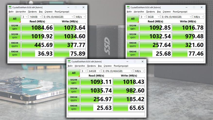 Производительность заметно снижается вследствие ограничений порта USB 3.2 Gen 2 (~1000 МБ/с чтение и запись). Такое ограничение связано исключительно с недостаточной мощностью моего тестового оборудования.