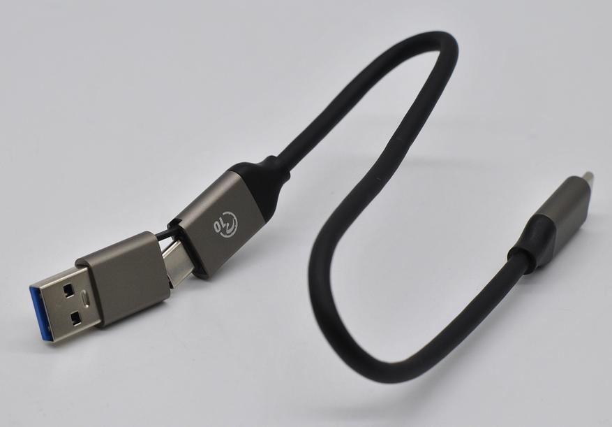 В кабеле сменный «наконечник» USB-A на Type-C, корпуса разъемов металлические: