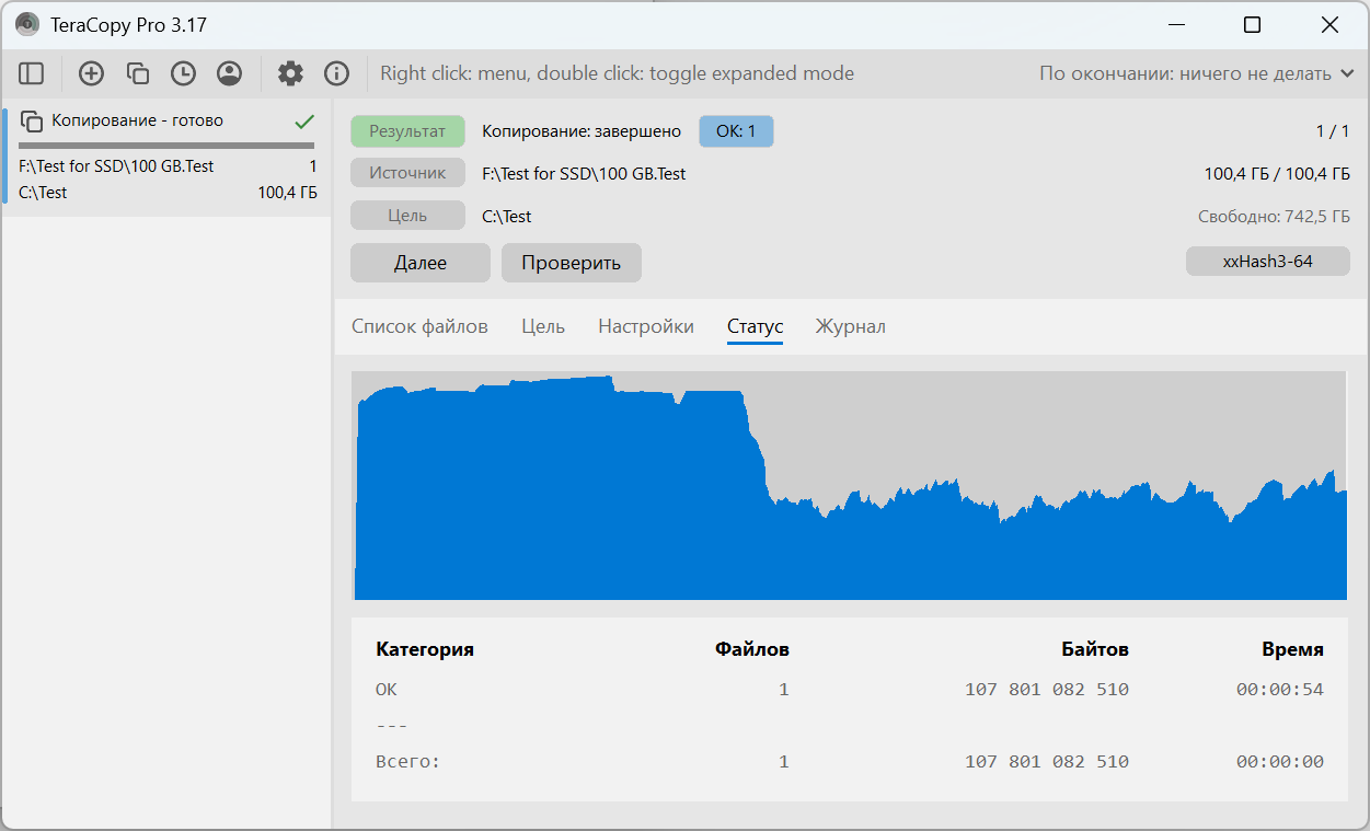 В практическом тесте копирования один файл объемом 100 ГБ переносится со средней скоростью около 1.8 ГБ/с, а при обратной операции скорость достигает примерно 2.6 ГБ/с. При работе с большим количеством мелких файлов производительность снижается примерно до 80 МБ/с, что связано уже в основном с особенностями файловой системы.
