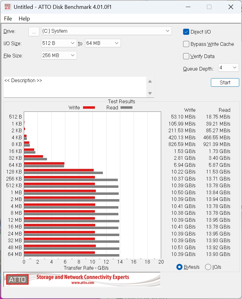 Еще один тест показывает последовательную скорость 10107 МБ/с при чтении и 7887 МБ/с при записи. При работе с блоками 4K накопитель демонстрирует 93.5 МБ/с на чтение и 240 МБ/с на запись, а при увеличении числа потоков результат возрастает до 3966 МБ/с и 5263 МБ/с соответственно. При этом время доступа остается очень низким: 0.034 мс для чтения и 0.016 мс для записи. При анализе производительности в зависимости от размера блока видно, что уже при размере 128 КБ скорость чтения превышает 11 ГБ/с, а далее стабилизируется примерно на уровне 13.7-13.9 ГБ/с. Скорость записи при крупных блоках держится примерно в диапазоне 10.3-10.5 ГБ/с.
