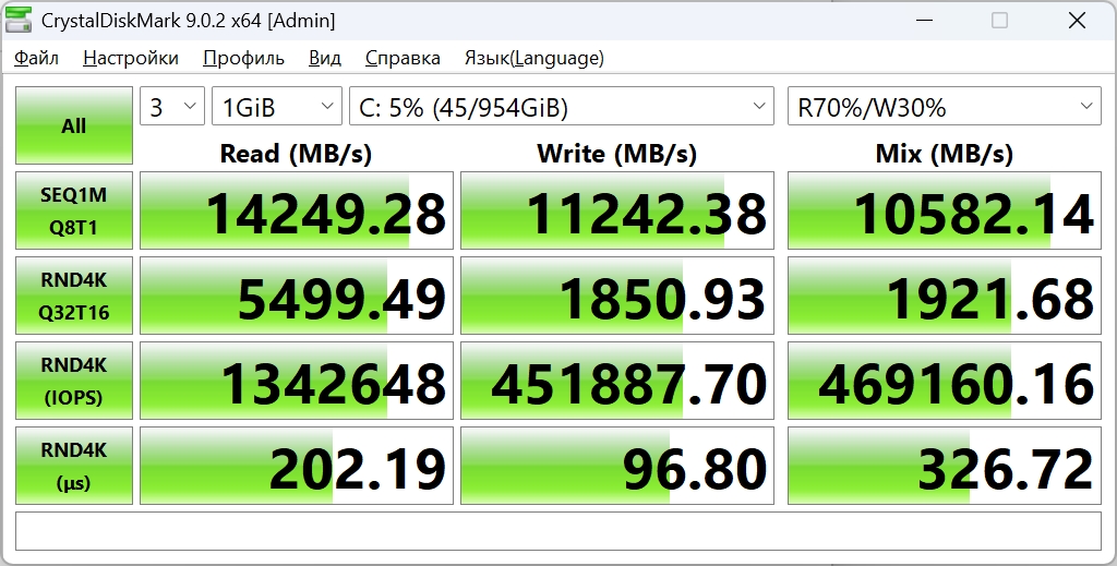В тестах последовательных операций накопитель показывает очень высокие результаты. Скорость чтения достигает 14249 МБ/с, а запись составляет 11242 МБ/с. Это практически максимальный уровень для интерфейса PCIe 5.0 и он хорошо совпадает с заявленными характеристиками устройства. При смешанной нагрузке показатель держится на уровне 10582 МБ/с, что также выглядит весьма уверенно. При операциях случайного доступа с высокой глубиной очереди накопитель демонстрирует 5499 МБ/с при чтении и 1850 МБ/с при записи. В пересчете на операции ввода-вывода это примерно 1.34 млн IOPS для чтения и около 452 тыс. IOPS для записи. Такой уровень характерен для быстрых NVMe SSD нового поколения.