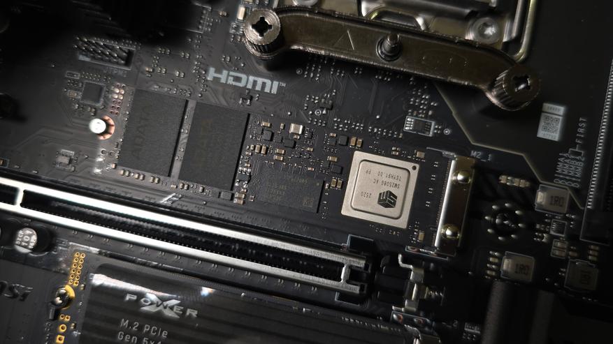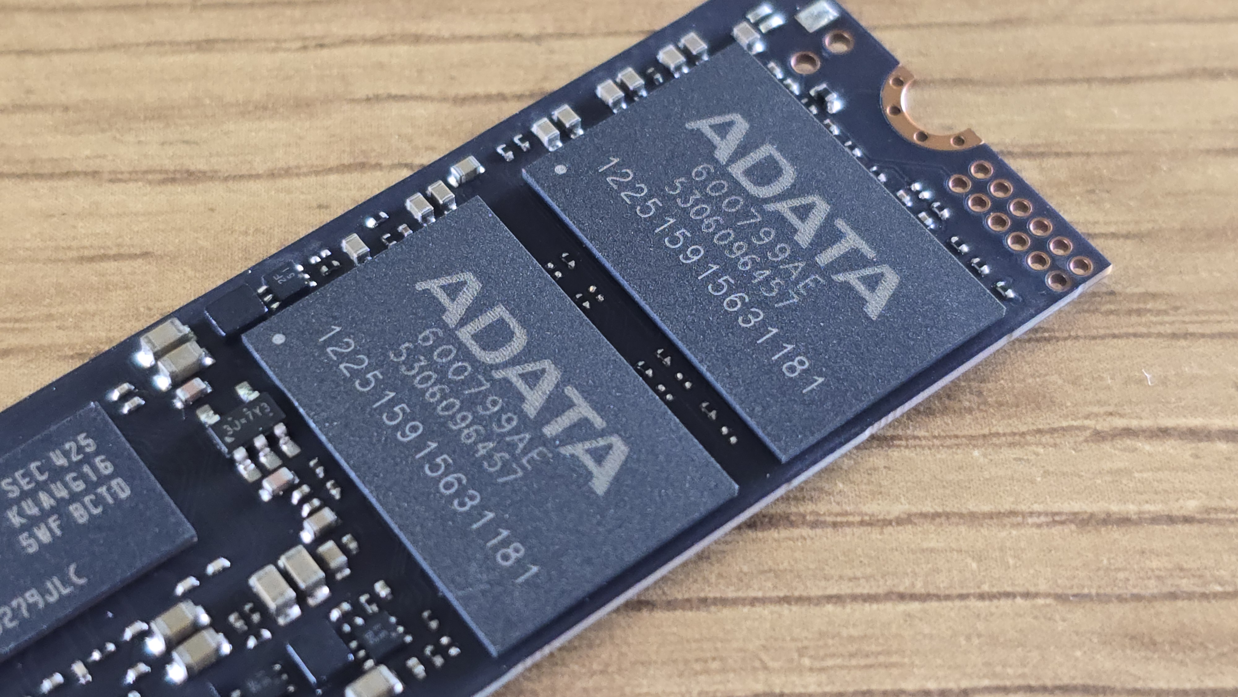 Флэш-память представлена микросхемами ADATA. На плате установлены крупные корпуса NAND-чипов с фирменной маркировкой производителя. Они формируют основной массив памяти накопителя и отвечают за хранение данных. Точный тип кристаллов в маркировке не раскрывается, однако известно, что используется современная 3D NAND-память. Микросхемы распределены по плате таким образом, чтобы контроллер мог работать с ними параллельно, обеспечивая высокую скорость обмена данными. Сама печатная плата выглядит аккуратно и хорошо собранной. Монтаж элементов плотный, но упорядоченный. Мелкие SMD-компоненты выстроены ровными рядами, пайка выполнена чисто, без наплывов припоя и заметных следов флюса. Силовая обвязка и вспомогательные элементы расположены компактно вокруг контроллера и микросхем памяти. Контактная часть интерфейса M.2 выполнена аккуратно, края разъема ровные, а отверстие под крепеж обработано без дефектов.