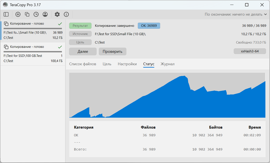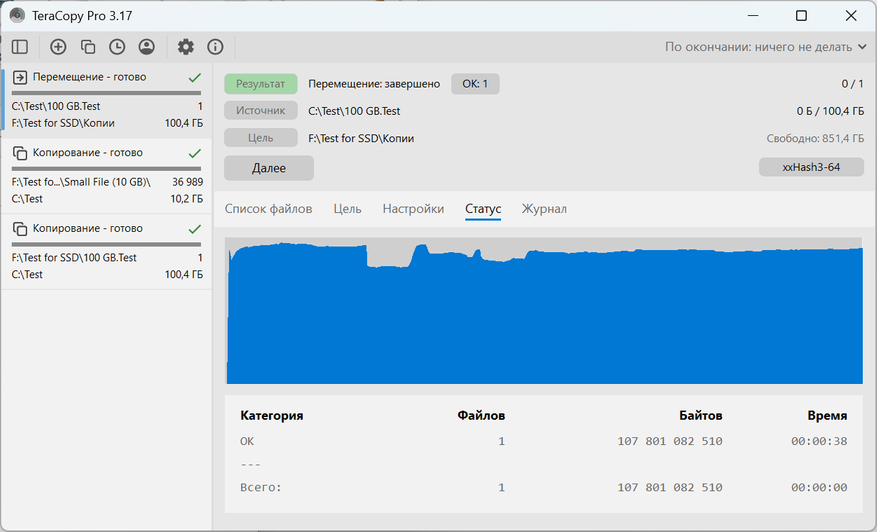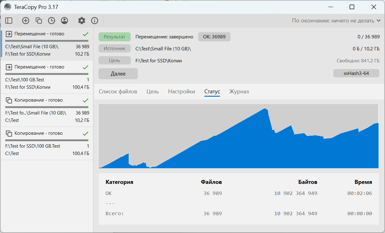 После этого те же данные переносились обратно на второй накопитель. При перемещении одного файла объемом 100 ГБ операция заняла 38 секунд, а средняя скорость составила примерно 2.6 ГБ/с. В этом случае график выглядит более ровным, без резких провалов, что объясняется тем, что часть данных уже находилась в кэше системы. Тест с мелкими файлами в обратную сторону дал почти тот же результат. Перемещение 36 989 файлов объемом 10.2 ГБ заняло 2 минуты 6 секунд, а средняя скорость составила около 82 МБ/с. Поведение графика практически повторяет предыдущий сценарий.