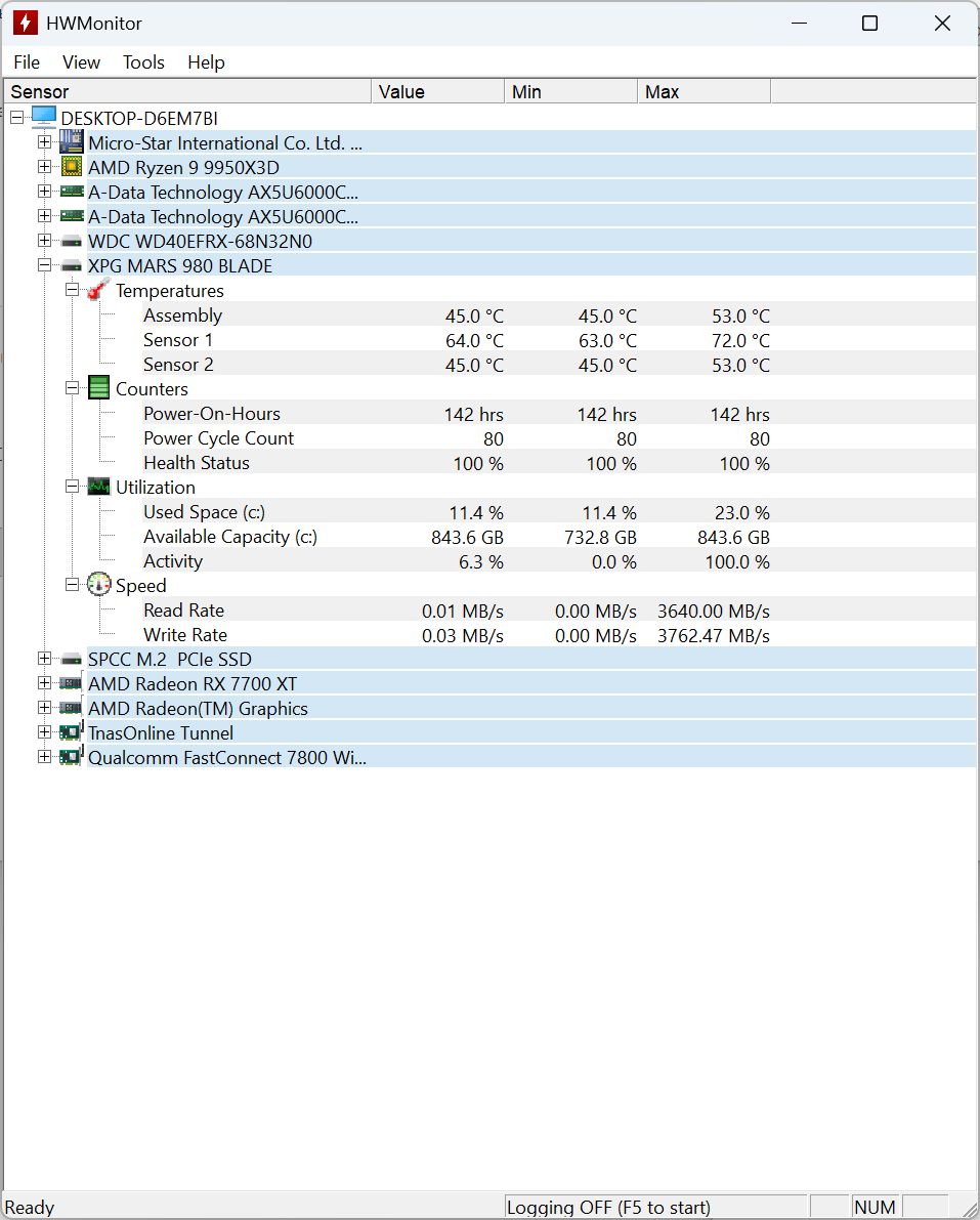 Отдельно посмотрел температурный режим накопителя во время тестов. В простое температура платы держится примерно на уровне 45°C. Это значение показывают датчики Assembly и Sensor 2. Основной нагрев фиксируется по Sensor 1, который обычно соответствует контроллеру. В процессе тестов температура поднималась до 72°C, при минимальном значении около 63°C. Даже под нагрузкой контроллер работает примерно в диапазоне 63-72°C, что для производительного SSD с интерфейсом PCIe 5.0 выглядит вполне нормальным показателем. Критических значений в ходе тестирования зафиксировано не было.