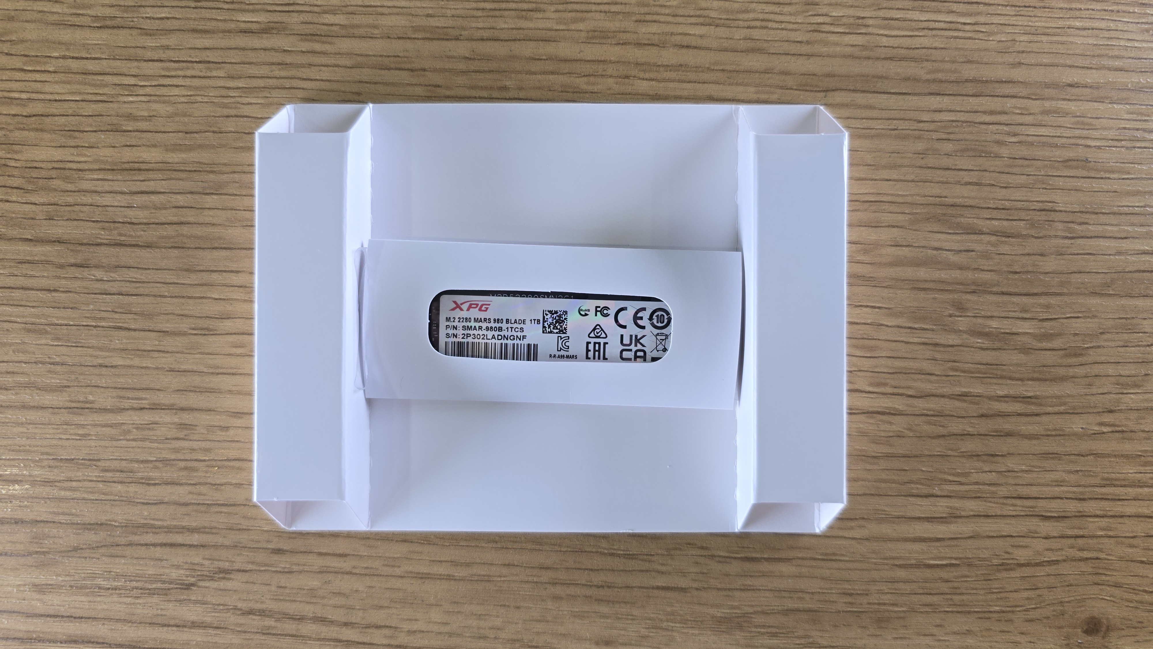 XPG Mars 980 Blade поставляется в компактной красной коробке, оформленной в фирменном стиле XPG. На лицевой стороне сразу показан сам накопитель с установленной теплорассеивающей пластиной, а рядом крупно указана емкость, в моем случае это версия на 1 ТБ. Сверху вынесены основные акценты: скорость до 14 ГБ/с, наличие DRAM-буфера, совместимость с ноутбуками и поддержка PS5. Внутри все устроено очень просто: сам накопитель уложен в картонный держатель, рядом находится тонкая декоративно-теплорассеивающая пластина, которую при необходимости можно установить на верхнюю сторону платы.