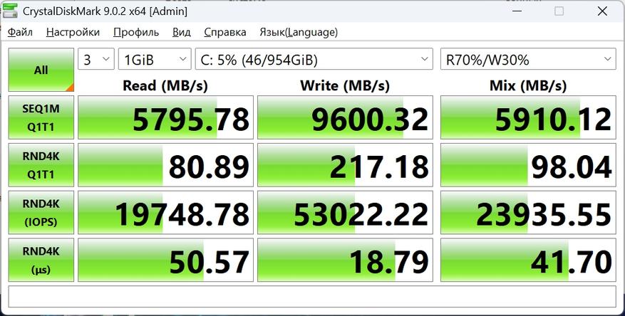 Если перейти к сценарию с минимальной очередью запросов, который ближе к реальной пользовательской нагрузке, показатели ожидаемо снижаются. Последовательное чтение в этом режиме составляет 5795 МБ/с, а запись 9600 МБ/с. Для случайных операций 4K получаем 80.9 МБ/с при чтении и 217 МБ/с при записи, что соответствует примерно 19.7 тыс. IOPS и 53 тыс. IOPS соответственно.