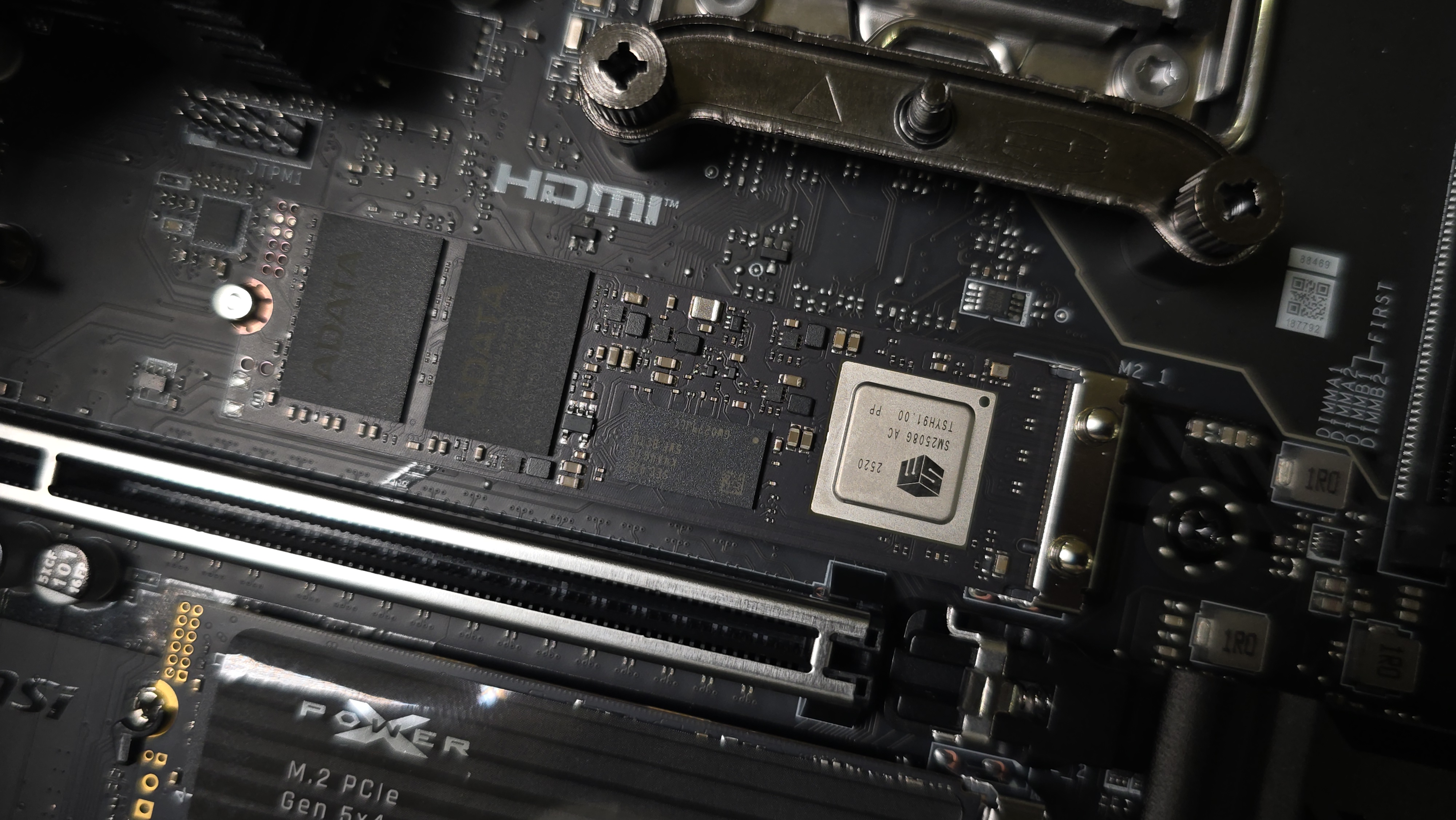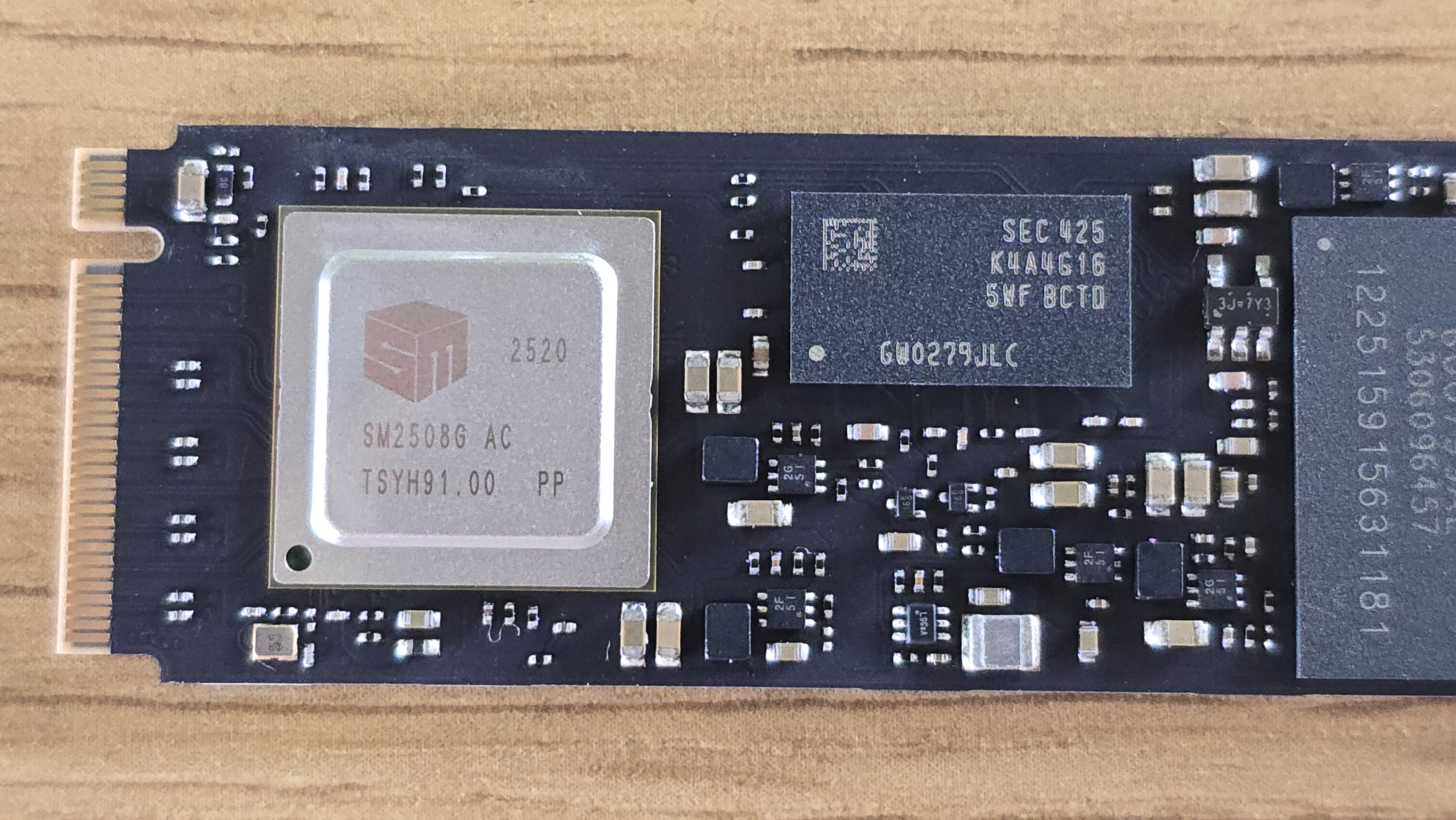 Если посмотреть на элементную базу, становится ясно, что перед нами достаточно современная аппаратная платформа. В основе накопителя используется контроллер Silicon Motion SM2508. Его маркировка хорошо читается на корпусе — SM2508G AC. Контроллер закрыт металлической теплораспределительной крышкой, которая помогает равномерно распределять тепло по поверхности корпуса. Этот контроллер относится к новому поколению решений Silicon Motion и рассчитан на работу с интерфейсом PCIe Gen5 x4. Он используется в высокоскоростных NVMe-накопителях и способен обеспечивать высокую пропускную способность, необходимую для современных систем.