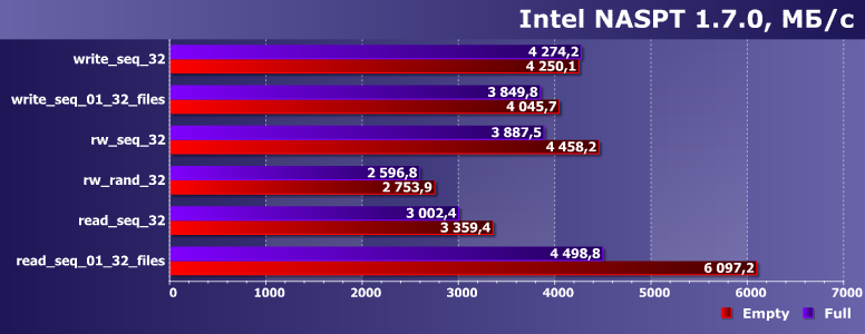 Не забывая, впрочем, о некоторых нюансах — которые для этой платформы тоже давно известны. Например, терабайтники демонстрируют очень высокую скорость чтения только из кэша, радиально проваливаясь на отлежавшихся данных — на столько, что могут оказаться и медленнее устройств более низких классов. Причина — память на терабитных кристаллах, откуда в такой конфигурации и лишь двукратное чередование. А в «пятигигабайтных» моделях на том же контроллере (или, в последнее время, чаще MAP1608 — но это практически одно и тоже) чаще встречается память с кристаллами по 512 Гбит. С другой стороны, никто такого в длинной перспективе не обещал, а на терабит переползла уже почти вся современная память (за редкими исключениями, типа Micron B57T), так что… Да и в любом случае скорости файловых операций просто выше запросов реального ПО. Здесь главное не нарваться на QLC — которая при неудачном стечении обстоятельств будет банально тормозить и при простом копировании больших объёмов данных.