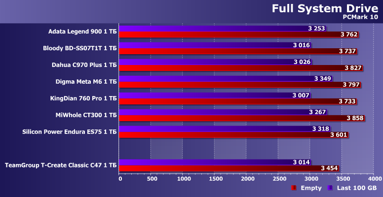 Впрочем, пользователь рискует и этого… не увидеть. Вот тут я собрал все протестированные терабайтники на этом контроллере, причём в двух из них совсем не каноническая память. Но в Silicon Power Endura ES75 используется Micron B58R того же класса — так что и результаты аналогичные. А выделяться должна Adata Legend 900 на QLC — но вывести её на чистую воду уже и PCMark 10 Storage не может даже при ограничении количества свободного места. Похоже и эта программа устарела (хотя замены ей до сих пор нет) — поскольку нагрузки срисованы с реальных, но все подтесты изолированы друг от друга. А на практике можно столкнуться и с тем, что кэш забьёт какая-нибудь фоновая программа, скорость которой не слишком важна (например, какой-нибудь торрент-клиент, спокойно упирающийся в интернет-канал), а тормозить из-за отсутствия в нём свободного места начнут приложения переднего плана — которым писать много не надо, зато нужно делать это быстро, если уж необходимость возникнет. А тут SSD ушёл в себя для расчистки данных — и всё. Подобным моделям такое не грозит, во всяком случае.