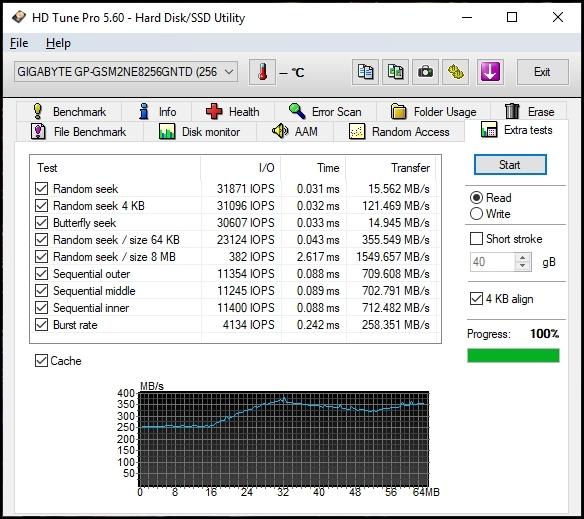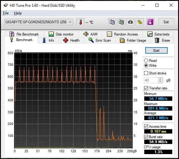 Все без исключения бенчмарки продемонстрировали для накопителя GIGABYTE M.2 PCIe SSD 256 Гб значения линейных скоростей чтения и записи, близкие к заявленным производителем на коробке.