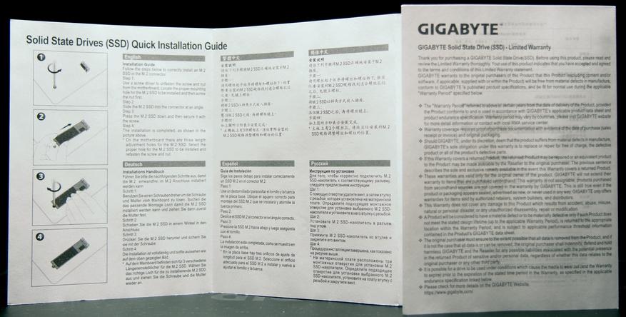 Помимо накопителя в коробке можно также обнаружить документацию. В ней подробно расписано о гарантии и порядке установки на материнскую плату. Производитель дает 3 года гарантии на GIGABYTE M.2 PCIe SSD 256 Гб, что для накопителей этого класса является нормой.