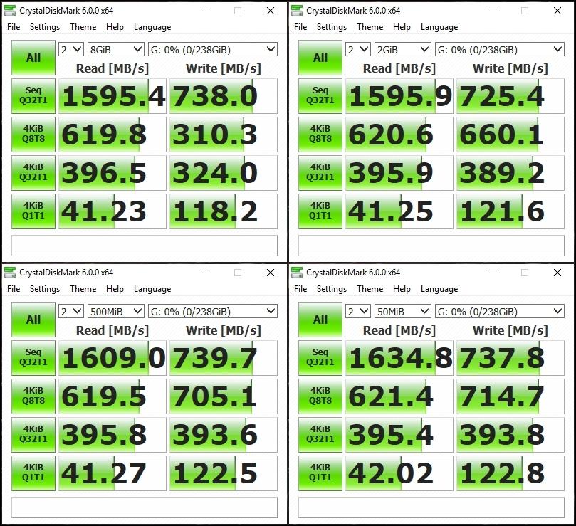 Для того, чтобы убедиться в заявленных производителем скоростях линейного чтения и записи, я провел тестирование в профильных программах для SSD накопителей. Использовал самые популярные тестовые пакеты AS SSD Benchmark 2.0.6485, ATTO Disk Benchmark 3.05, CrystalDiskMark 6.0.0 и HD Tune Pro 5.60.