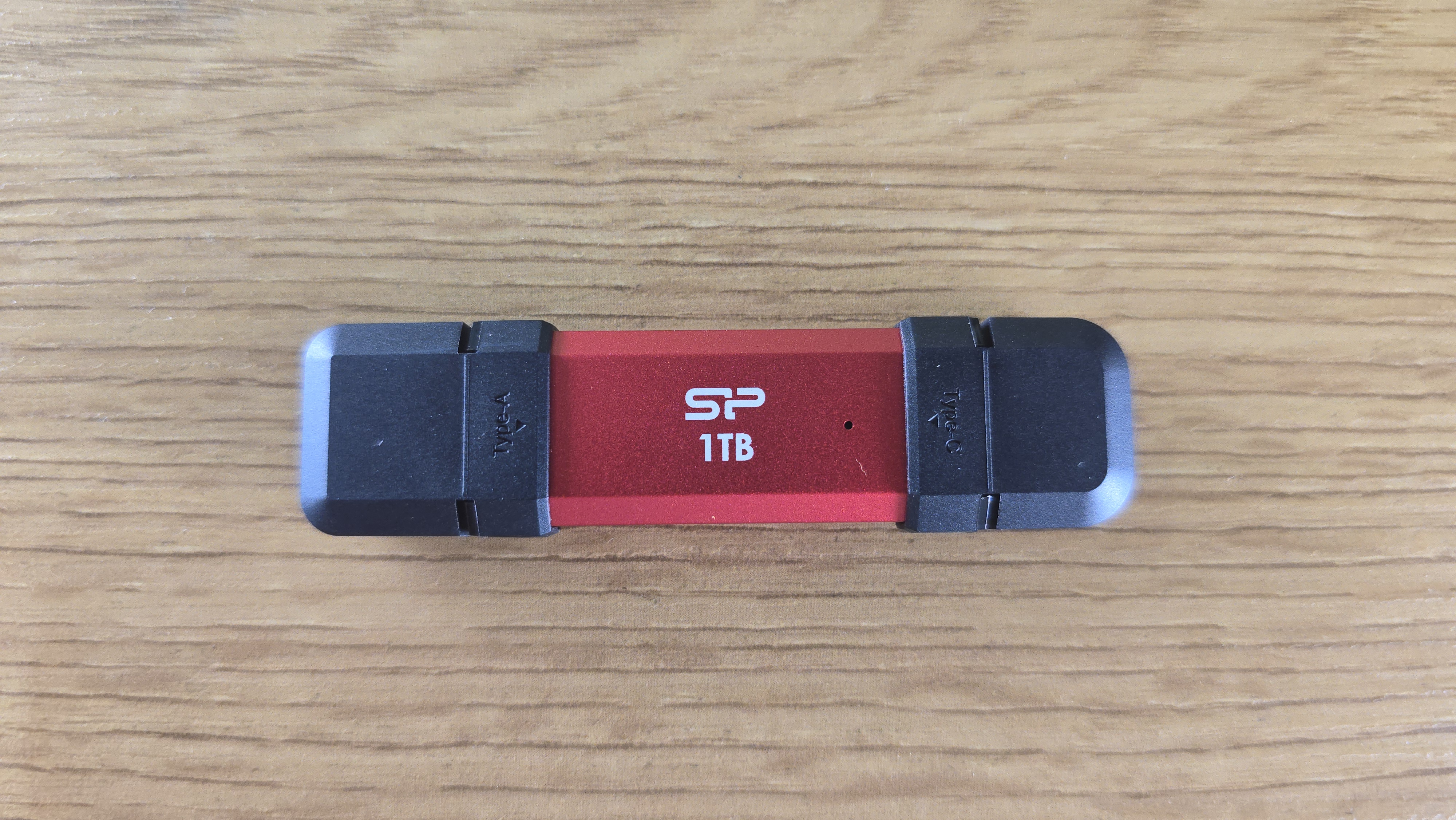 Корпус выполнен в красном цвете. Центральная часть металлическая, с матовой поверхностью. На ней нанесен логотип SP и обозначение объема 1TB. Рядом расположен небольшой светодиодный индикатор активности.