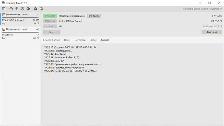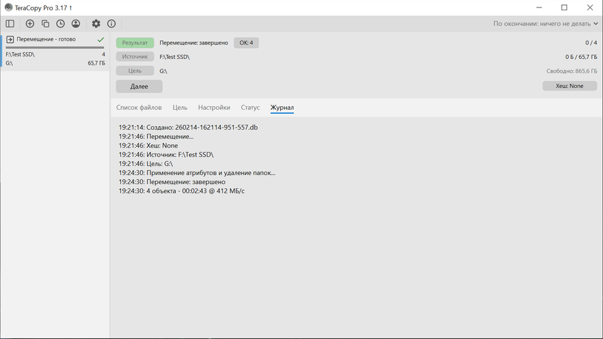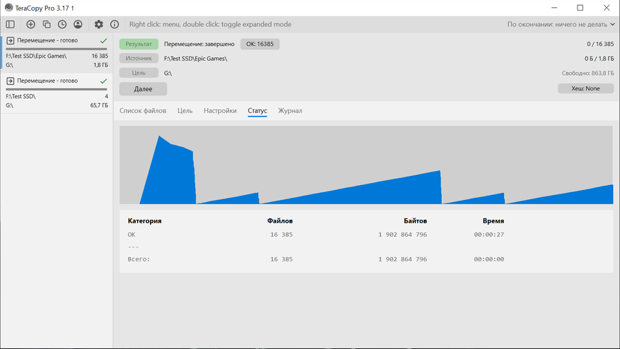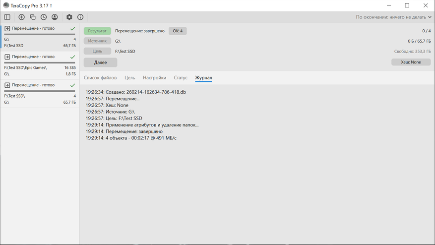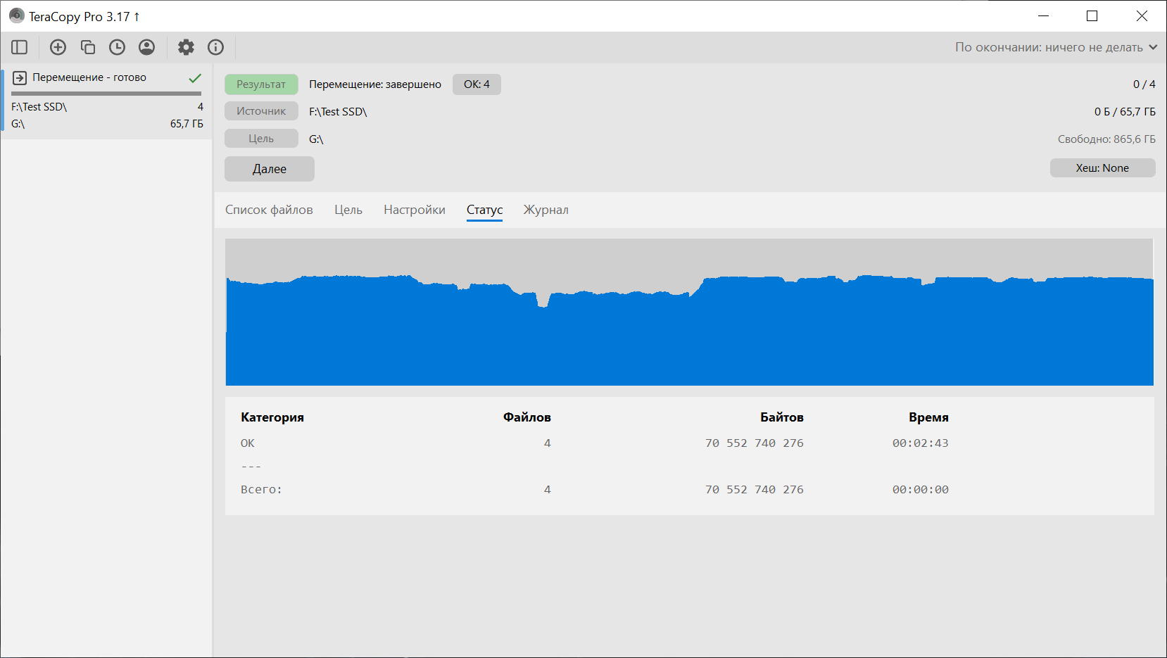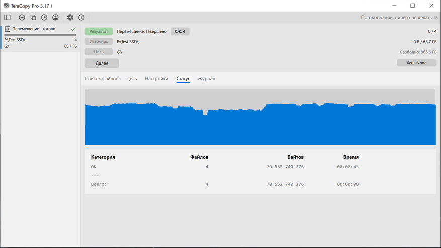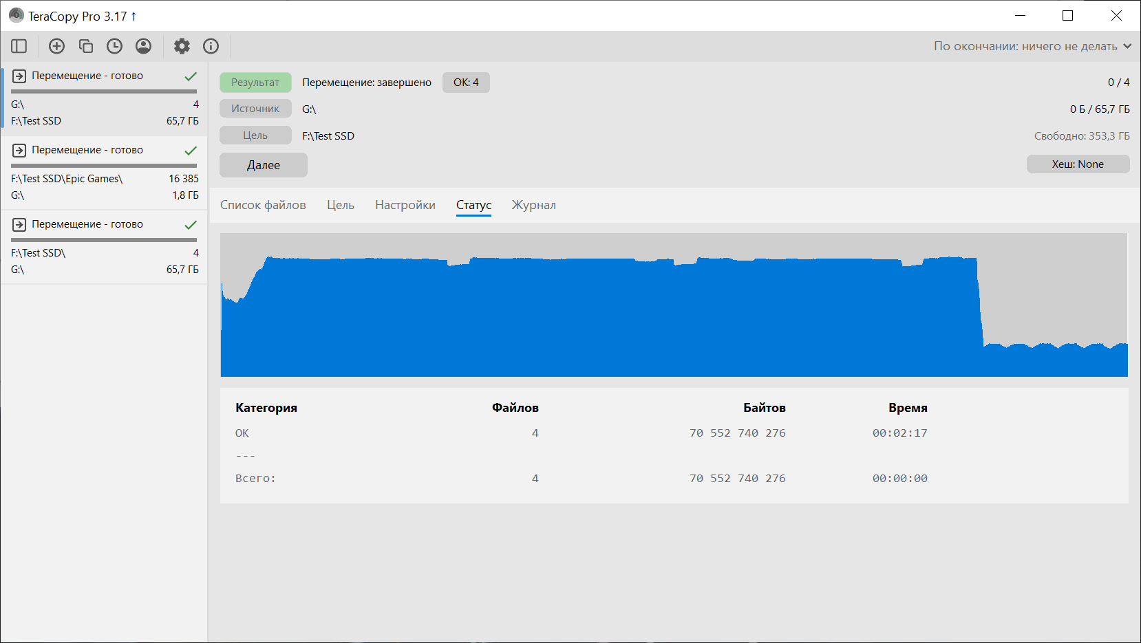 Далее переходим к практическим сценариям. Копирование выполнялось между встроенным NVMe и Silicon Power DS72. С NVMe на DS72 было перемещено 4 файла общим объемом 70 552 740 276 байт, время составило 00:02:17. Средняя скорость по журналу — 491 МБ/с. По графику видно, что основная часть передачи держалась на высоком уровне, а ближе к завершению наблюдается снижение скорости.