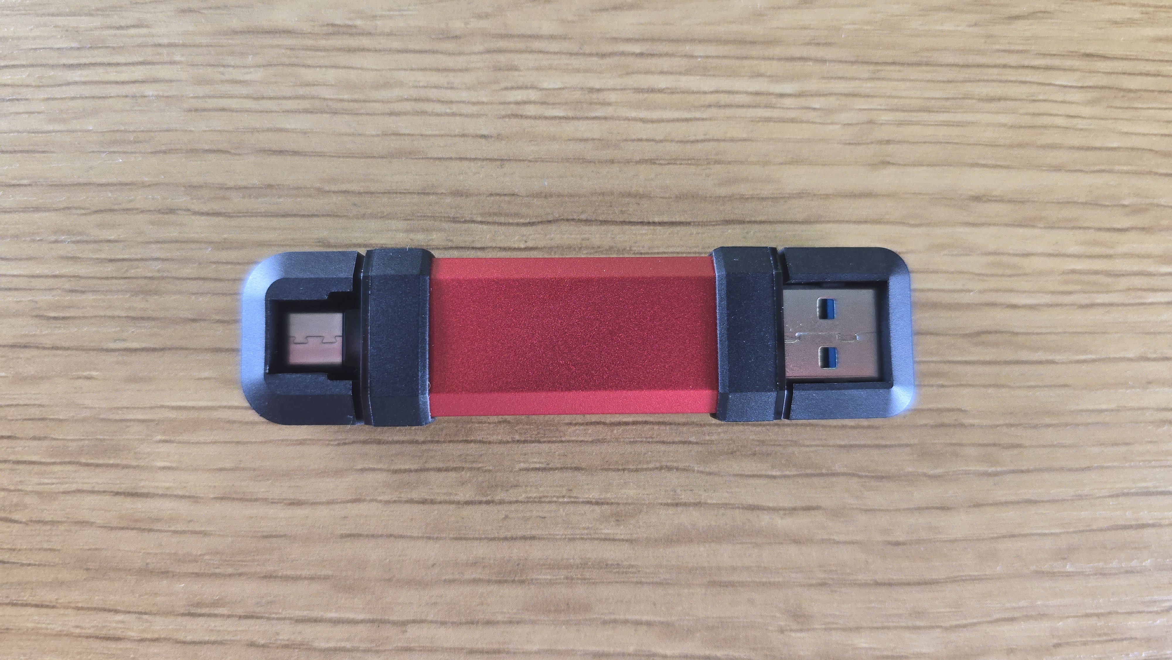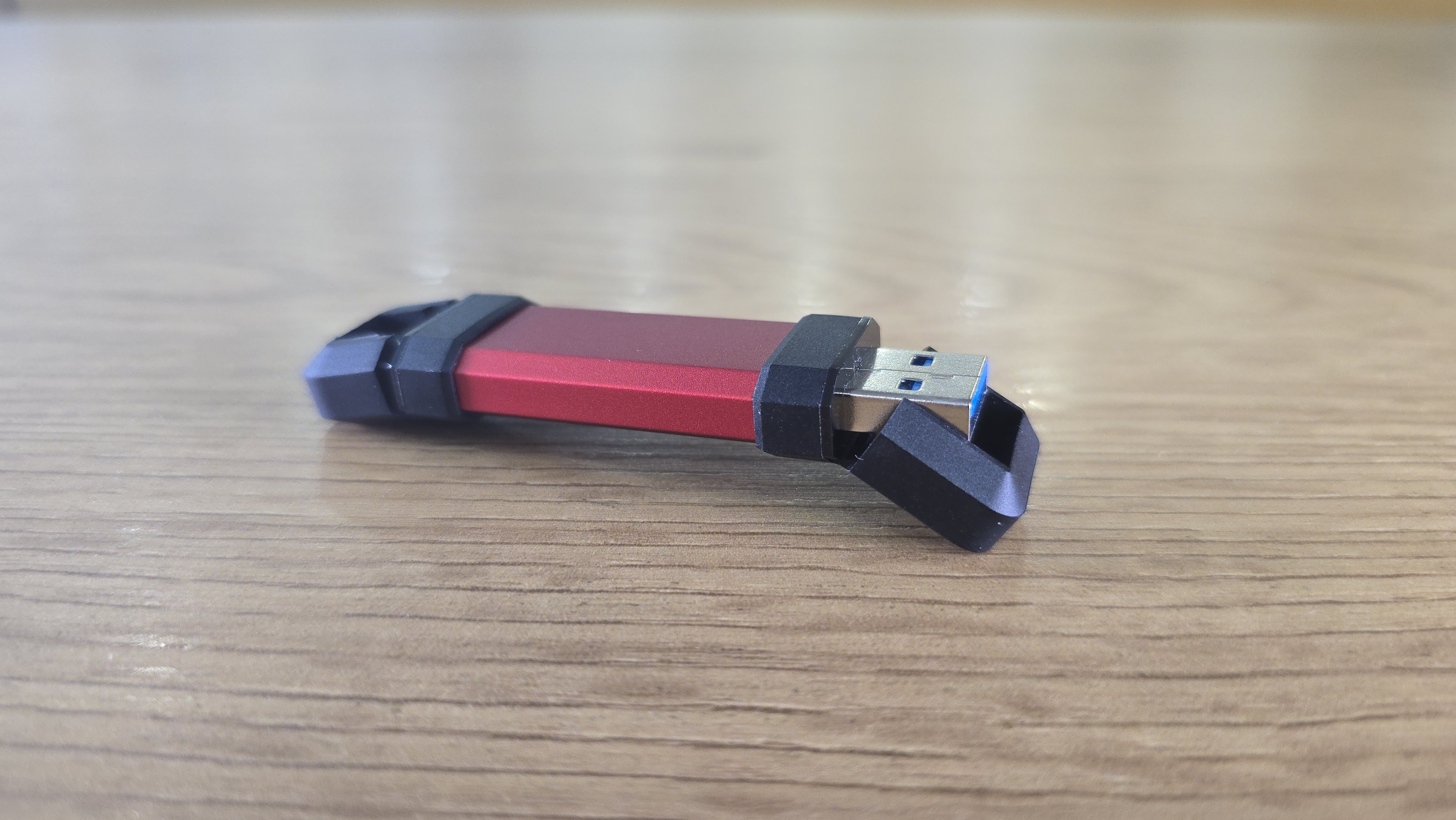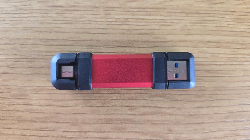 С двух сторон находятся черные защитные колпачки. Они несъемные и закреплены на корпусе. На одном из них есть маркировка Type-A, на другом Type-C. Под колпачками скрываются соответствующие разъемы. USB Type-A имеет синюю вставку, что характерно для версии с высокой пропускной способностью.