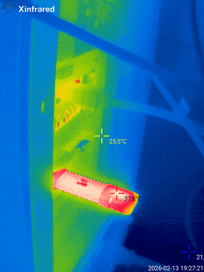 После двух часов непрерывной линейной записи в AIDA64 я дополнительно проверил температуру корпуса тепловизором. Максимальное значение составило 37.6 °C. Температура окружающей среды на момент замера была около 23.5 °C. Разница — примерно 14 градусов. С учетом длительности нагрузки это хороший результат. Даже после продолжительной записи накопитель не выходит за пределы 40 °C. Для компактного корпуса без активного охлаждения это важный момент. При такой температуре речи о перегреве или агрессивном термодросселировании не идет.