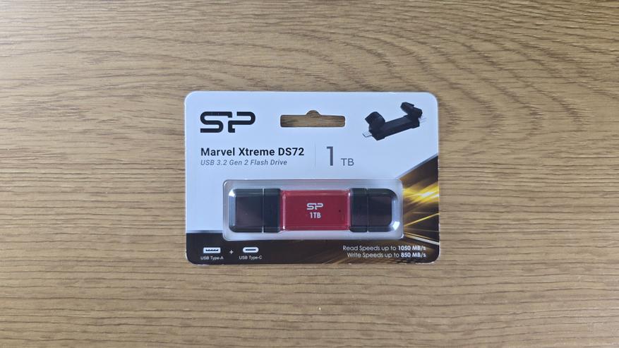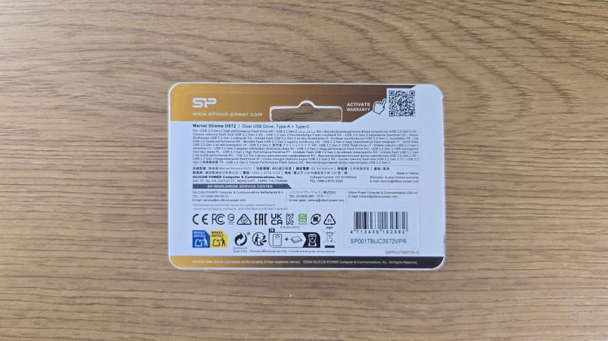 Накопитель поставляется в компактном блистере с прозрачным окном по центру. Устройство сразу видно целиком, без вскрытия. На лицевой стороне указано название Marvel Xtreme DS72, объем 1 TB и интерфейс USB 3.2 Gen 2 Flash Drive. Внизу отдельно отмечены разъемы USB Type-A и USB Type-C. Там же заявлены скорости: чтение до 1050 MB/s и запись до 850 MB/s. На обратной стороне размещена техническая информация: указание модели DS72, Dual USB Drive Type-A + Type-C, QR-код для активации гарантии, указано питание DC 5V/900mA и гарантия 5-year limited warranty. Производство — Made in Taiwan.