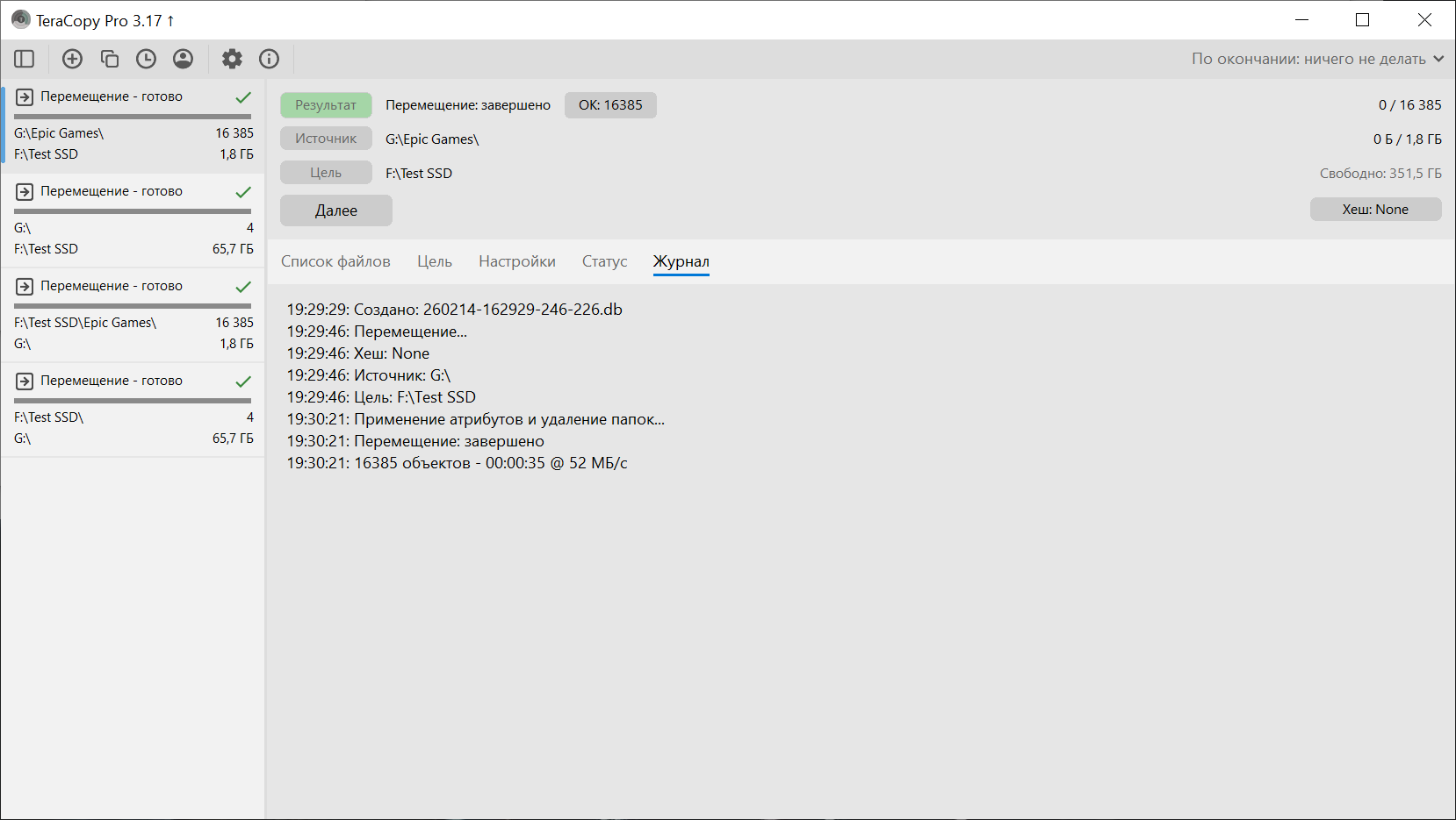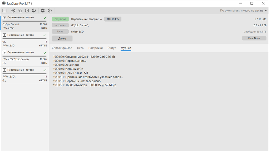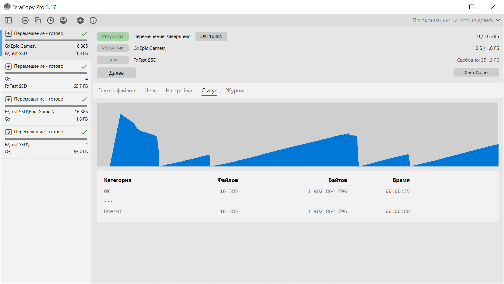 Второй сценарий — папка 1 902 864 796 байт (16 385 файлов). Время — 00:00:35, средняя скорость — 52 МБ/с. При работе с большим количеством мелких файлов скорость закономерно ниже.