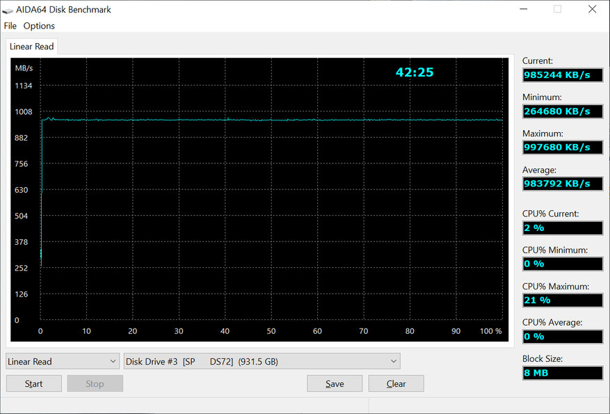 График чтения практически ровный. После старта накопитель держит около 980-990 МБ/с на всем протяжении теста. Резких просадок нет.