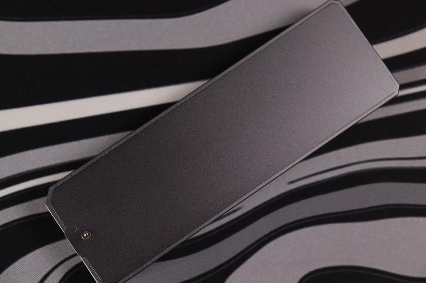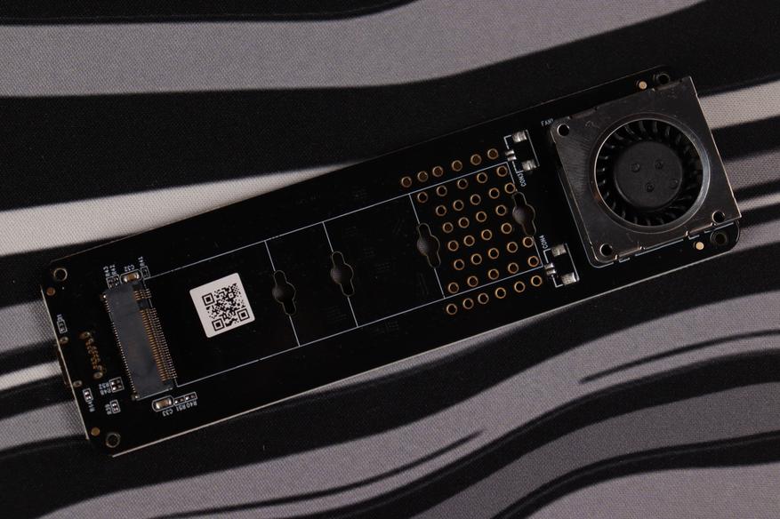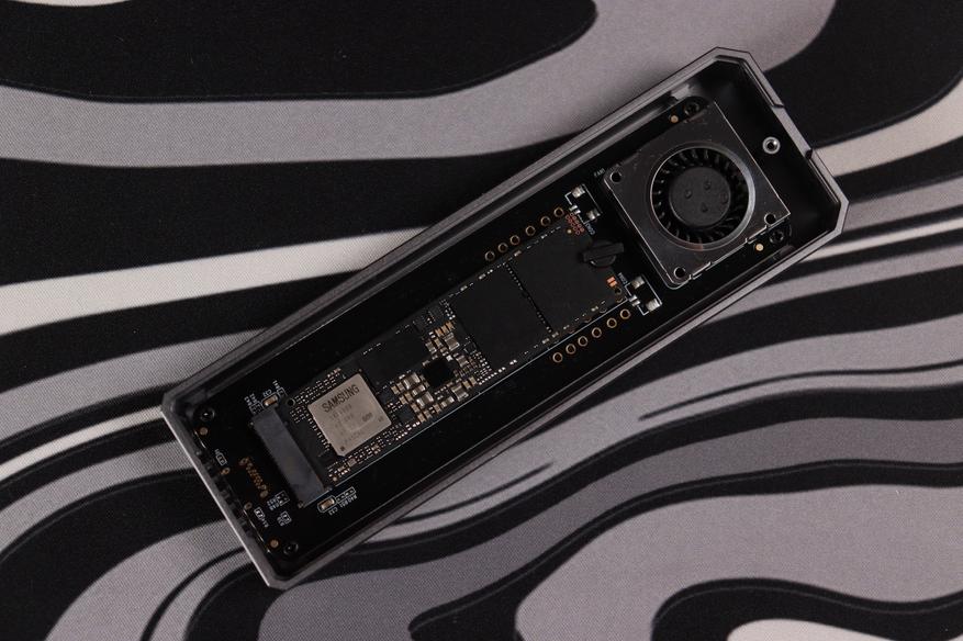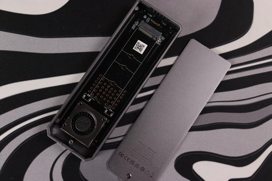 Особенностью конструкции является раздельная сборка корпуса — нижняя крышка снимается после откручивания винта на обратной стороне, открывая доступ к универсальному слоту M.2, где также и разместился вентилятор. Внутри предусмотрены посадочные места для всех популярных типоразмеров с чёткой маркировкой позиций крепления. В моем случае используется накопитель формата 2280.