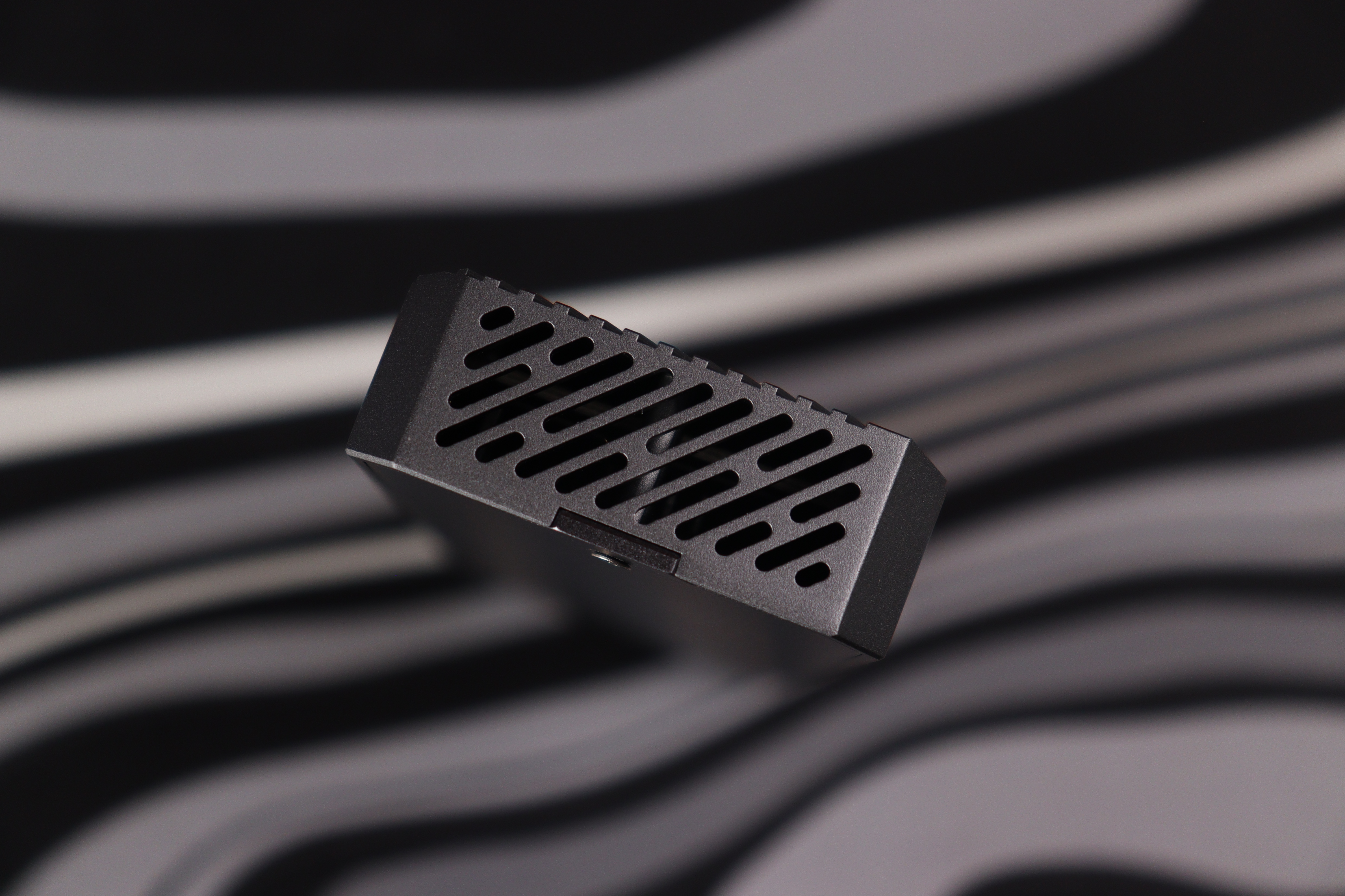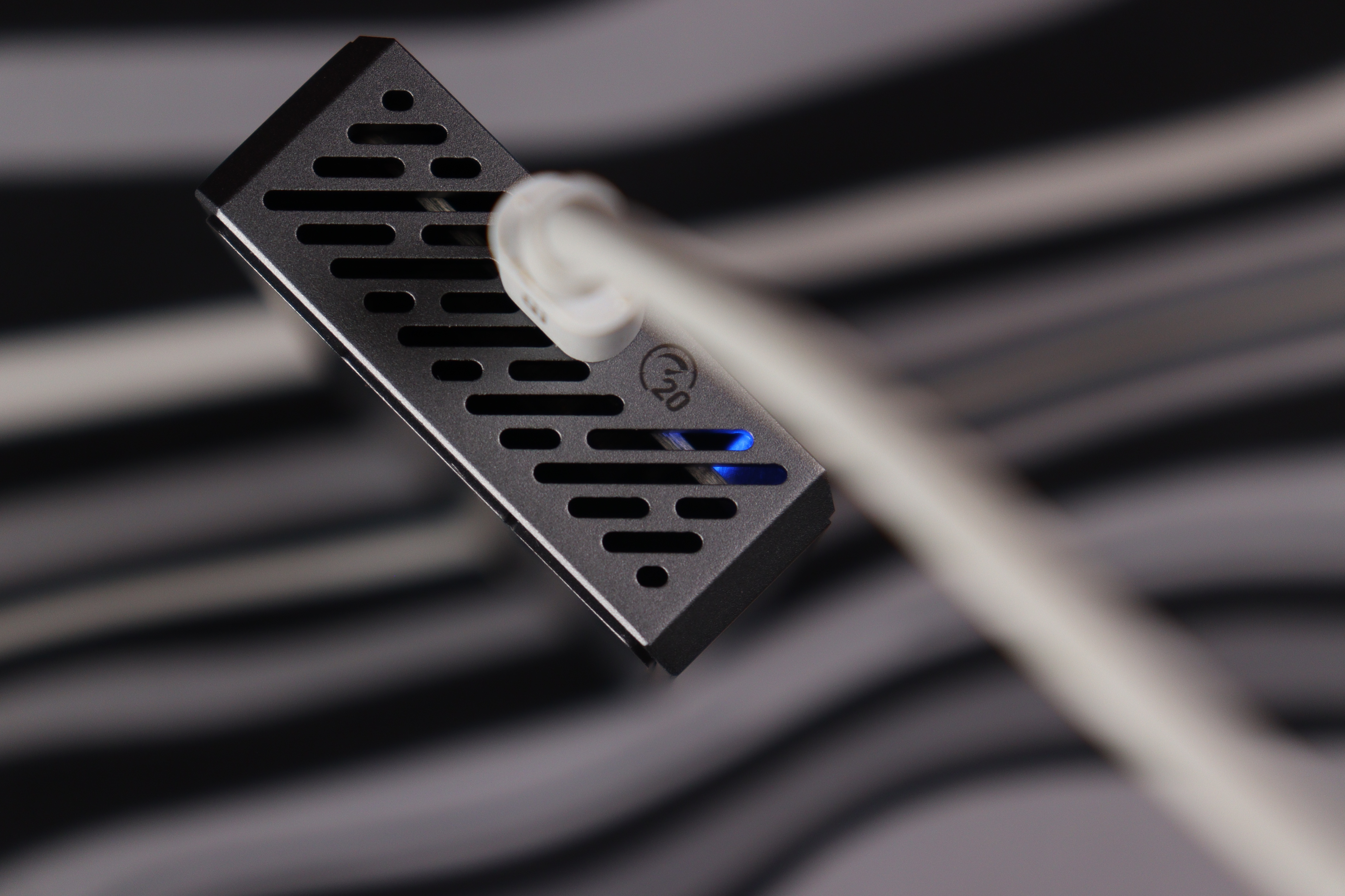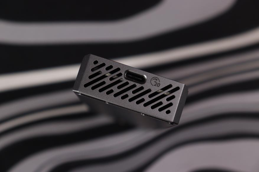 Внешний корпус изготовлен из анодированного алюминия с матовой текстурой, которая не только придаёт устройству симпатичный внешний вид, но и препятствует скольжению в руках, кроме того, это помогает лучше отводить тепло. USB-C разъём расположен на торце устройства и утоплен внутрь корпуса для защиты от повреждений. Рядом размещён небольшой LED-индикатор активности голубого цвета с приятным мягким свечением.