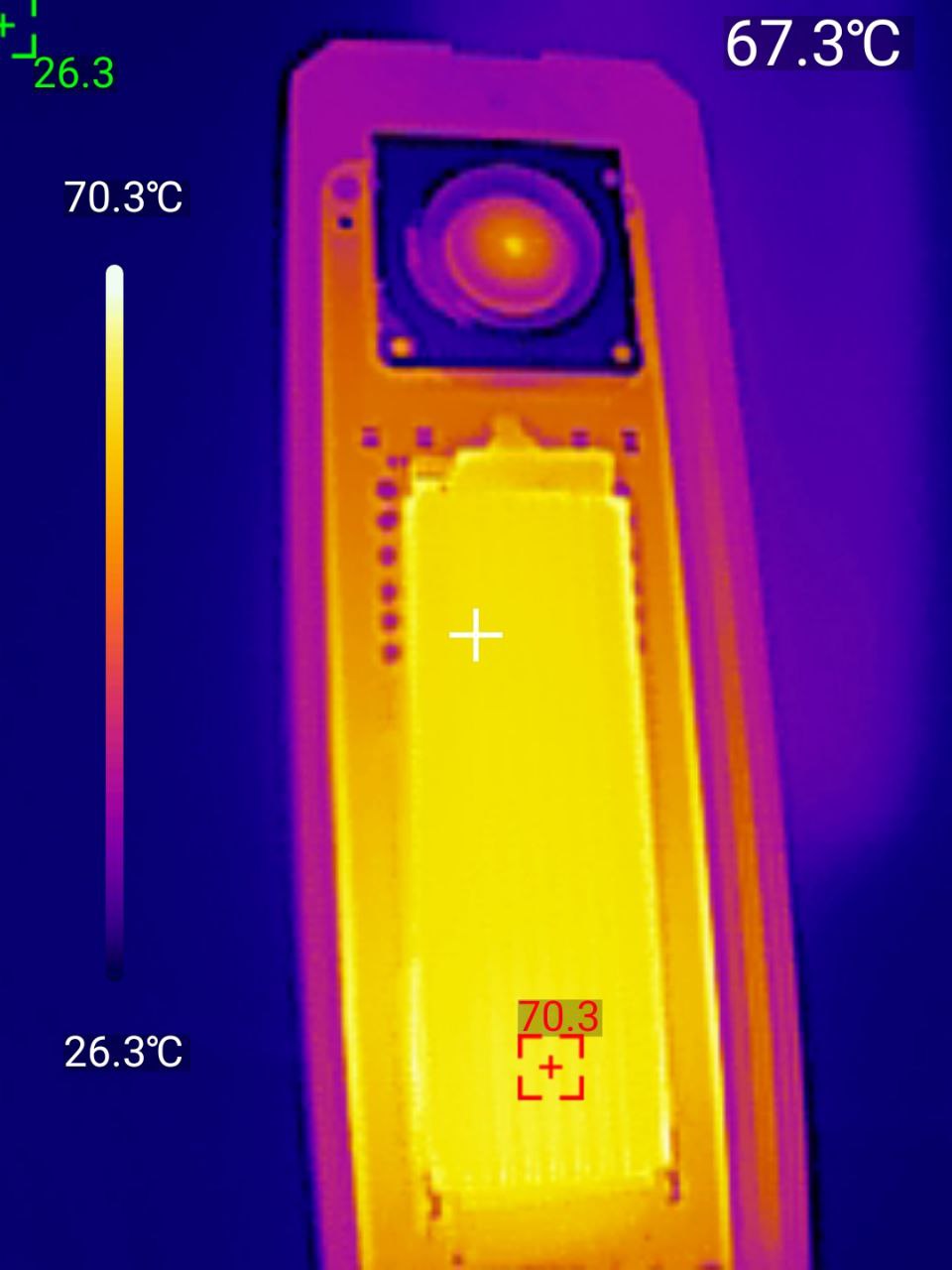 Внешний корпус Orico CNM2-G20 представляет собой амбициозную попытку создать максимально производительное решение для портативного накопителя с активным охлаждением. Устройство действительно способно обеспечить заявленную скорость 20 Гбит/с и демонстрирует впечатляющие результаты в тестах линейного чтения, однако реализация системы охлаждения оказалась компромиссной и не всегда справляется с отводом тепла при интенсивных нагрузках. Ключевая проблема кроется в конструктивном решении — использование компактного радиатора вместо массивного алюминиевого корпуса приводит к критическому нагреву накопителя до 72°C при операциях линейной записи, что близко к порогу троттлинга. Активный вентилятор, хоть и помогает, но не способен полностью компенсировать недостаточную площадь теплоотвода. Это делает устройство менее подходящим для продолжительных операций записи больших объёмов данных.