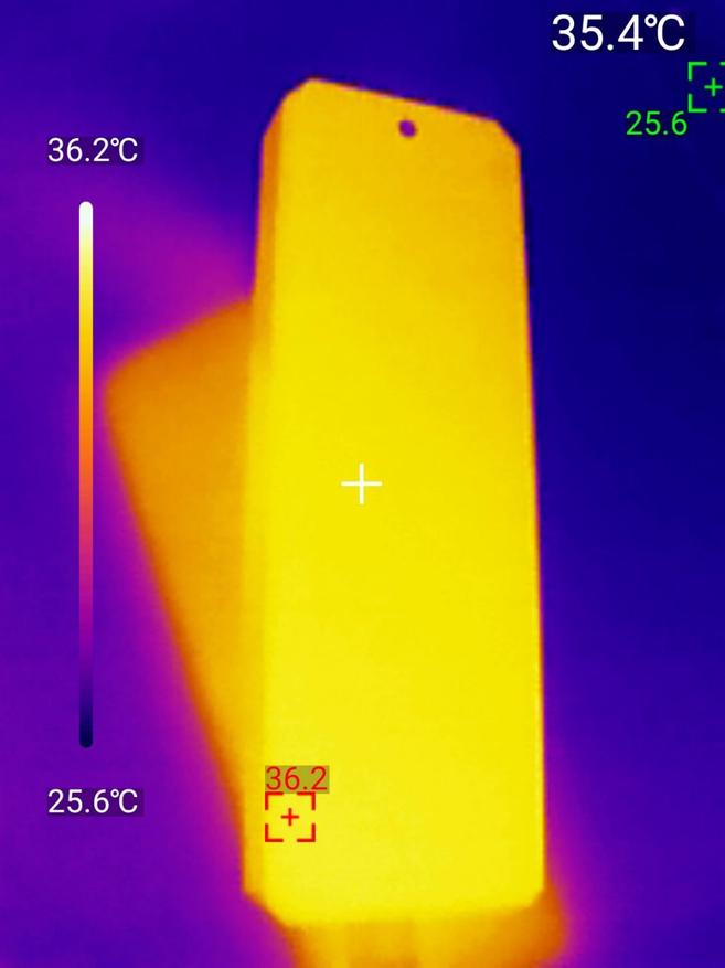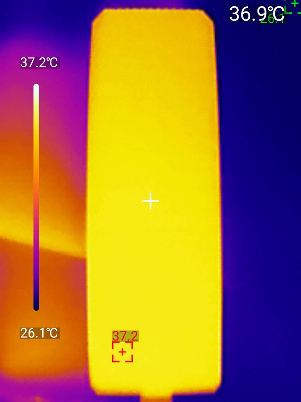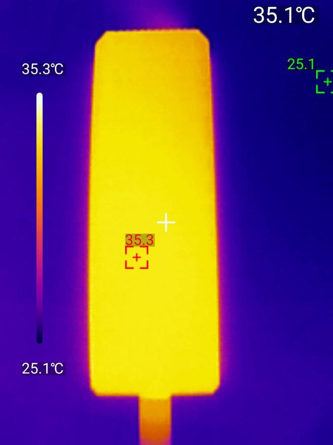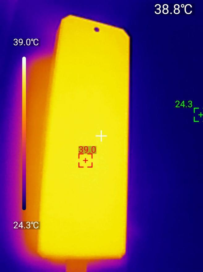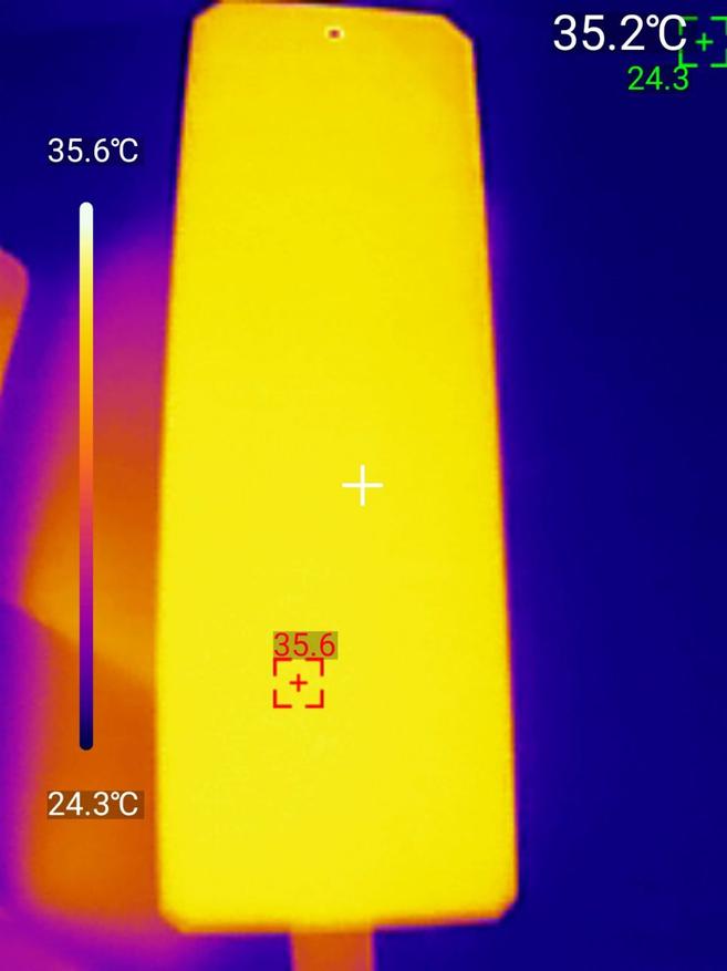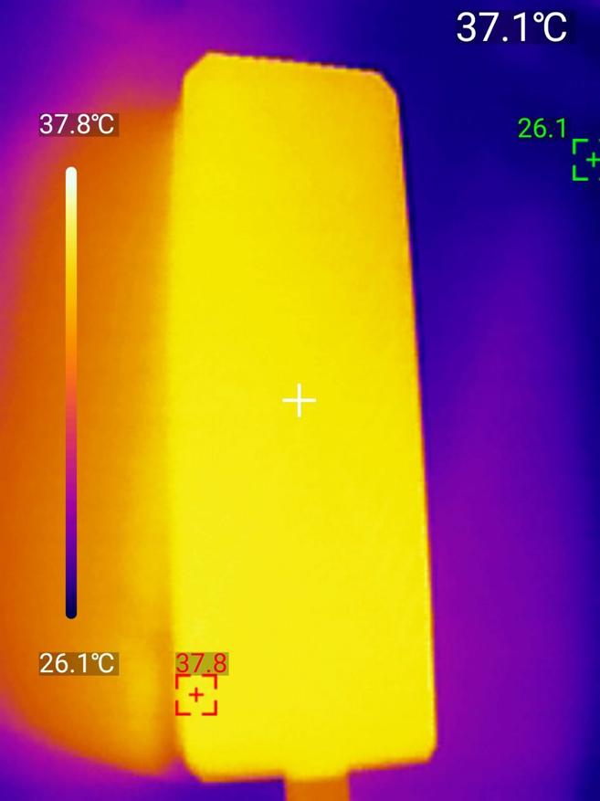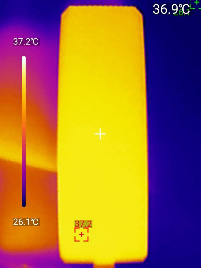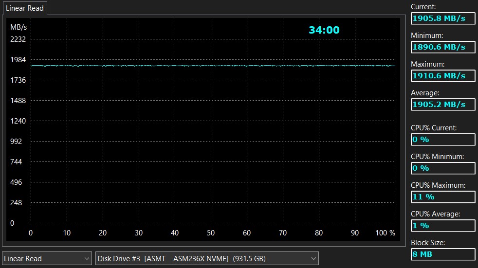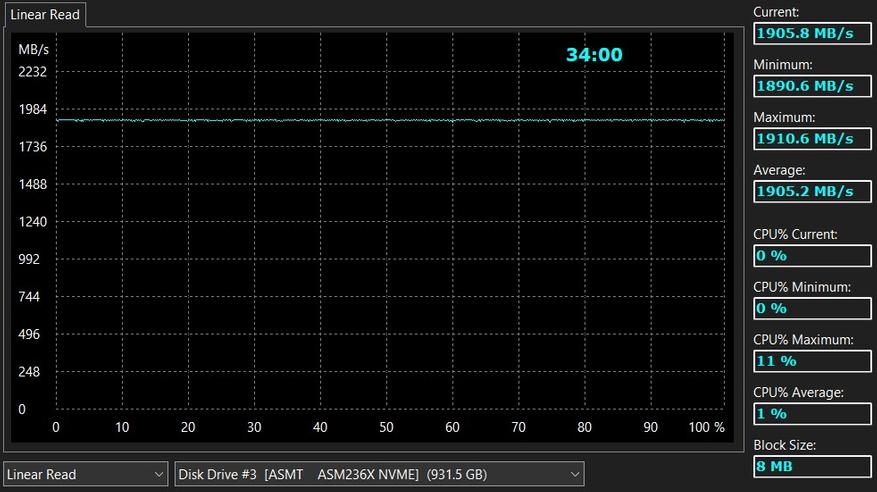 Анализ производительности линейного чтения показал стабильность работы накопителя. График демонстрирует равномерную производительность в диапазоне 1890-1910 МБ/с со средним значением 1905,2 МБ/с на протяжении всего теста. Накопитель же прогрелся ощутимо — до 54 градусов, а корпус (измерения проведены с помощью тепловизора UNI-T UTI260M) оставался относительно прохладным — 37.2 градусов.