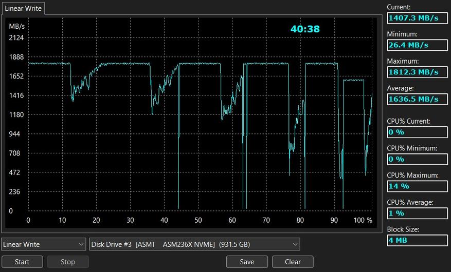 Тест линейной записи выявил характерный ступенчатый профиль производительности с периодическими резкими провалами, что типично для современных TLC NAND накопителей при исчерпании SLC-кэша. График демонстрирует скорость записи в диапазоне от критичного минимума 26,4 МБ/с до максимальных 1812,3 МБ/с со средним значением 1636,5 МБ/с за 40 минут 38 секунд тестирования с блоками размером 4 МБ. Отчётливо видны пять циклических провалов производительности, когда скорость кратковременно падает до уровня прямой записи в TLC-память, после чего восстанавливается до номинальных значений благодаря работе алгоритмов кэширования контроллера. Но тут виден нагрев накопителя, близкий к троттлингу — 72 градуса. Сказывается использование небольшого радиатора, и несмотря на активное охлаждение — этого недостаточно для нормальной работы. И в это же время корпус остается просто тёплым