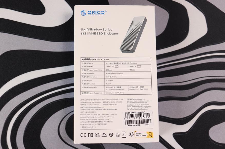 Упаковка выполнена в минималистичном стиле, характерном для продукции Orico. На лицевой части упаковки размещена фотография устройства, а также ключевые спецификации с заявленной скорость до 2000 МБ/с. Задняя сторона коробки содержит подробные технические характеристики на нескольких языках.