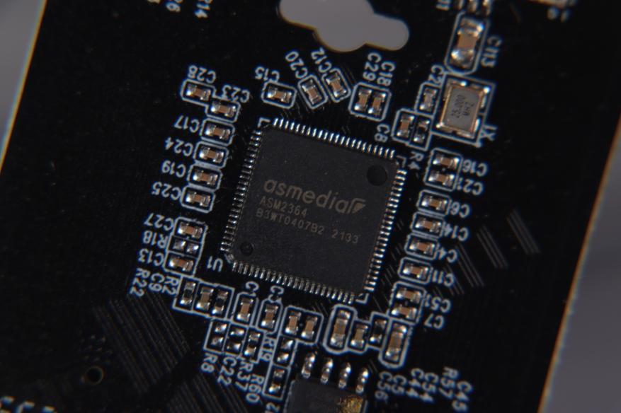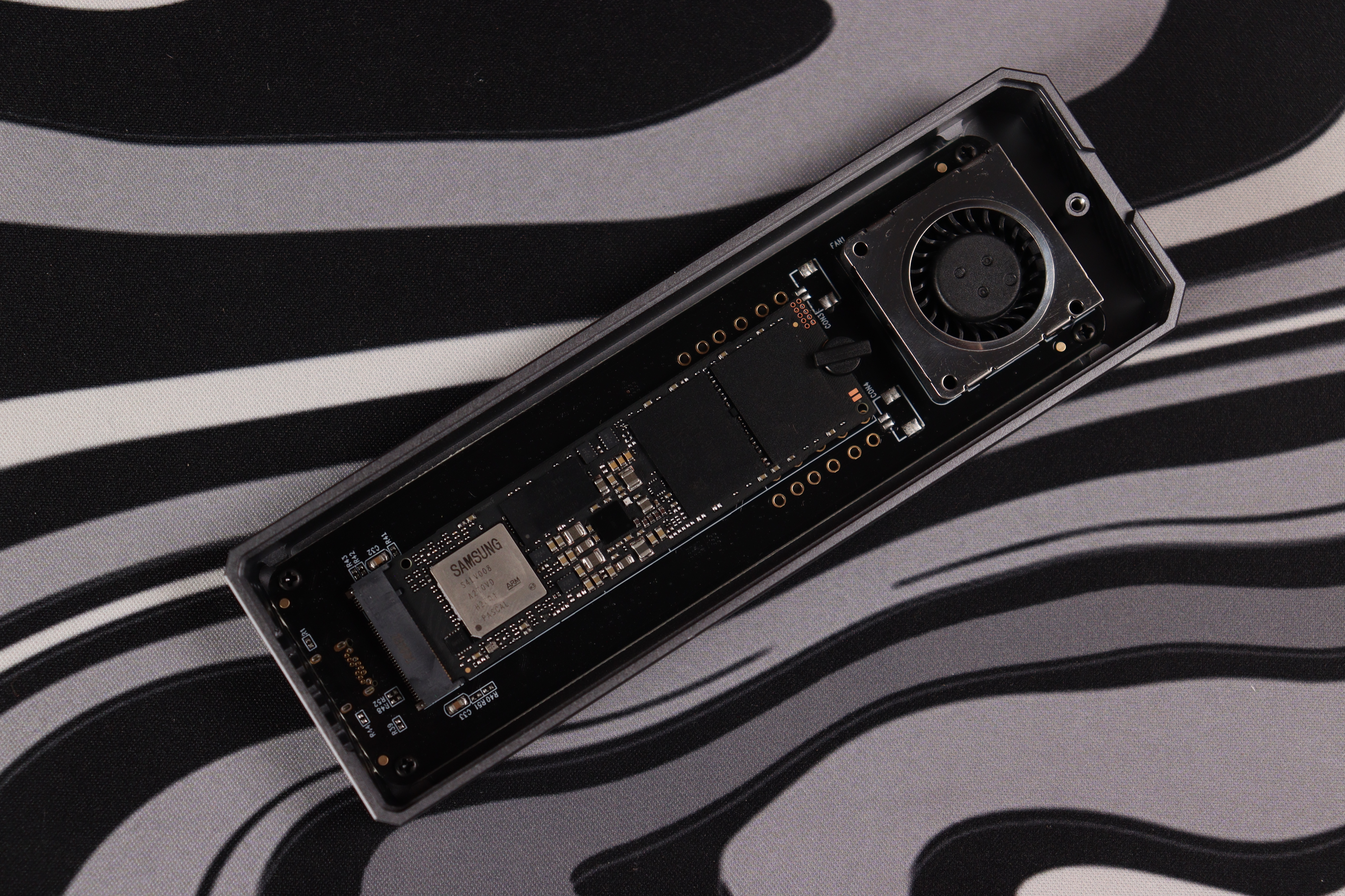 Доступ к основной плате можно получить 4 винта, находящиеся на углах. В основе устройства лежит контроллер Asmedia ASM2364, реализующий скорость передачи данных на уровне 20 Гбит, согласно протоколу USB3.2 Gen2x2