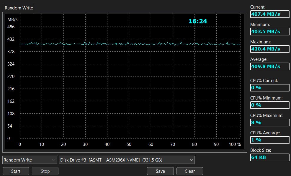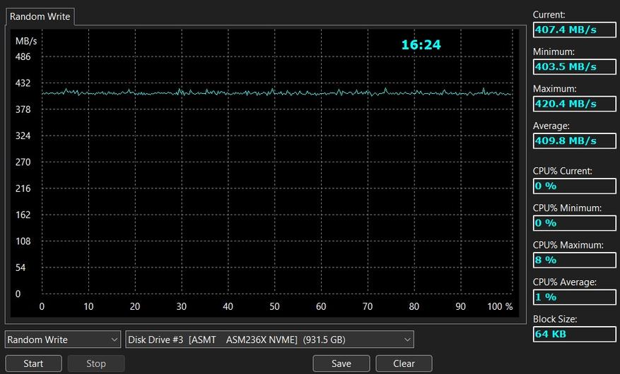 Тест случайной записи продемонстрировал стабильность накопителя при работе с небольшими блоками данных размером 64 КБ. График показывает равномерную производительность в узком диапазоне 405,7-420,4 МБ/с со средним значением 409,8 МБ/с за 16 минут 24 секунды, что свидетельствует об эффективной работе алгоритмов контроллера SSD при обработке произвольных операций записи. Отсутствие резких колебаний и провалов скорости указывает на качественную реализацию системы управления износом и оптимизацию размещения данных в памяти накопителя. При этом температура ссд устаканилась на уровне 53 градусов.