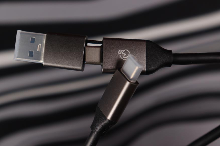 - Кабель USB-C to USB-C с пропускной способностью 20 Гбит длиной 30 см и переходником под USB-A;
