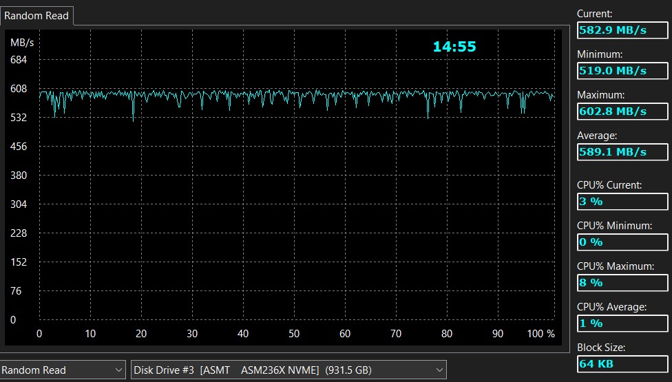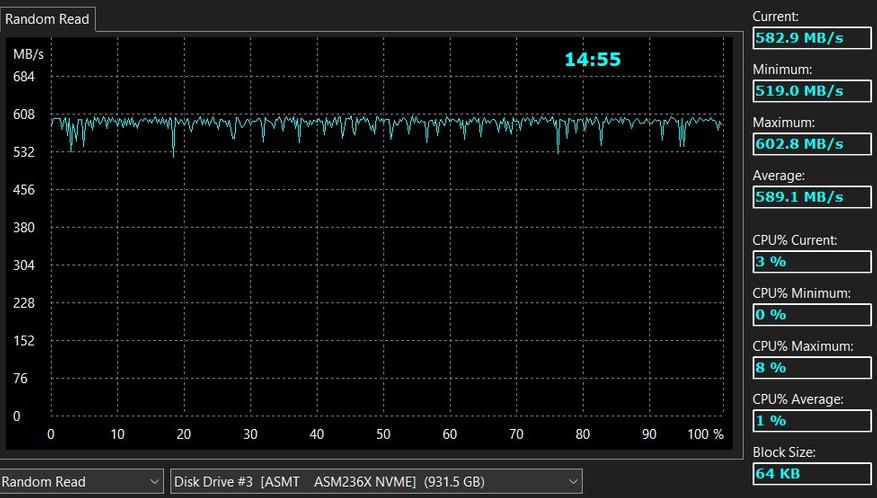 Тестирование случайного чтения с блоками размером 64 КБ показало характерную волнообразную картину производительности в диапазоне 519-602,8 МБ/с при среднем значении 589,1 МБ/с за 14 минут 55 секунд. График демонстрирует периодические флуктуации скорости, что типично для операций произвольного доступа и объясняется особенностями работы контроллера SSD при обращении к различным областям памяти. Температура чуть снизилась, накопитель — 52 градуса, корпус — 36.2.
