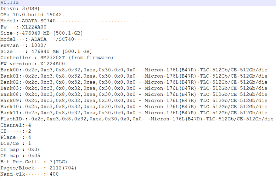 Начинаем, как водится, с изучения «внутреннего мира» девайса. Подключив накопитель, мы сразу же видим его идентификацию: ADATA SC740. Он распознается напрямую через USB, никаких лишних адаптеров или хабов в цепочке нет. В операционной системе доступно 476 940 МБ, что полностью соответствует заявленной емкости в полтерабайта. Заглянув в прошивку, обнаруживаем контроллер SM2320XT, а в качестве флеш-памяти использованы чипы Micron 176L с маркировкой B47R, типа TLC. Эта память организована по схеме 4 каналов, 2 CE, 4 plane и 1 die на CE. Глубина записи, как и положено для TLC, составляет 3 бита на ячейку.