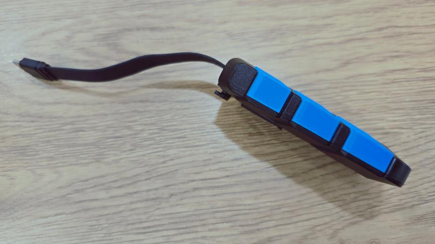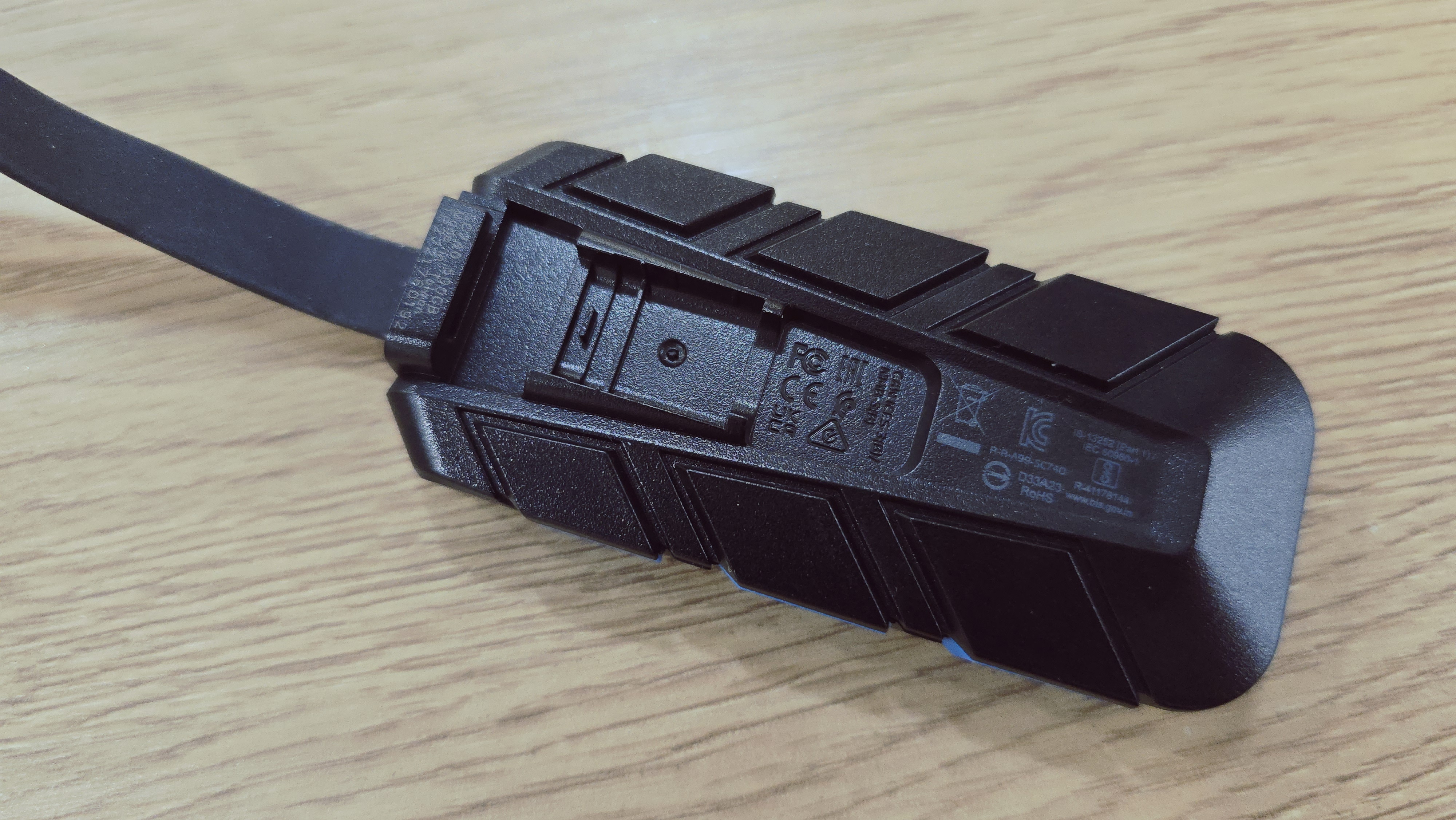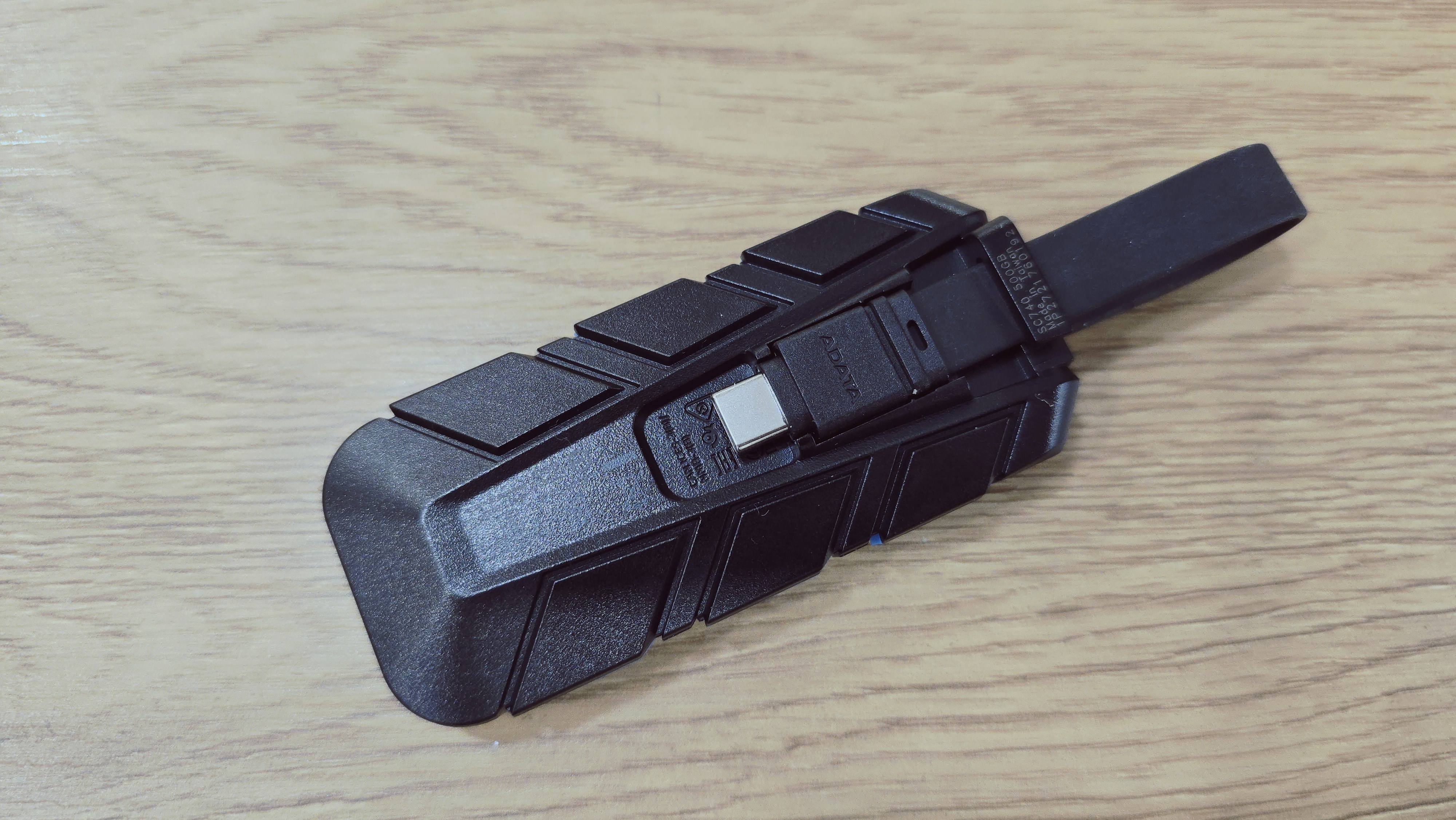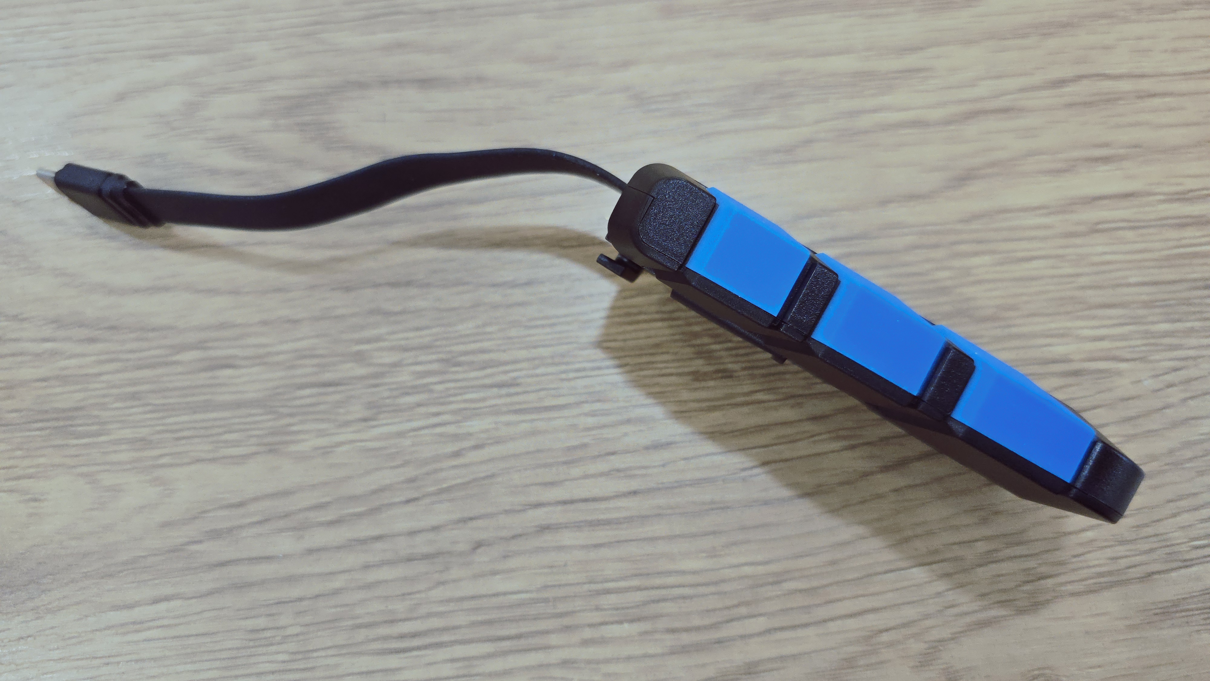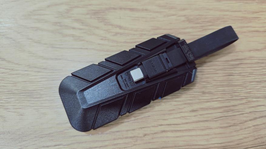 В задней части расположен встроенный кабель USB-C. В сложенном состоянии он плотно укладывается вдоль нижней грани корпуса и фиксируется в направляющих, не выступая за габариты устройства. Разъем USB-C находится на конце кабеля и в сложенном виде утоплен в корпус. На этой поверхности также расположена техническая маркировка и сертификационные обозначения.