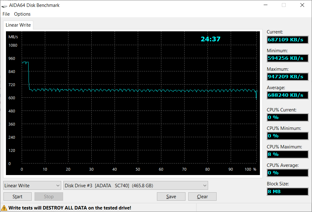 Наступает черед, пожалуй, самого показательного теста: AIDA64. Здесь мы отслеживаем поведение накопителя на протяжении всего доступного объема, используя линейное чтение и запись с размером блока 8 МБ.